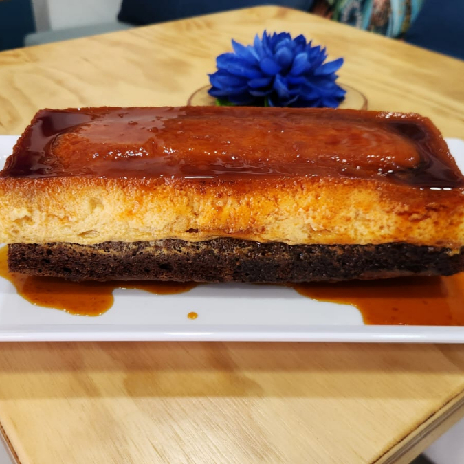 Delicioso postre que combina pastel de chocolate con un flan de vainilla y salsa de caramelo. Porción de 80 grm aprox