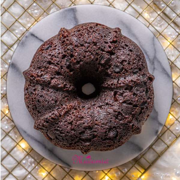 suave bizcocho de vainilla combinado con chocolate y deliciosas nueces de macadamia. crocante y deliciosa