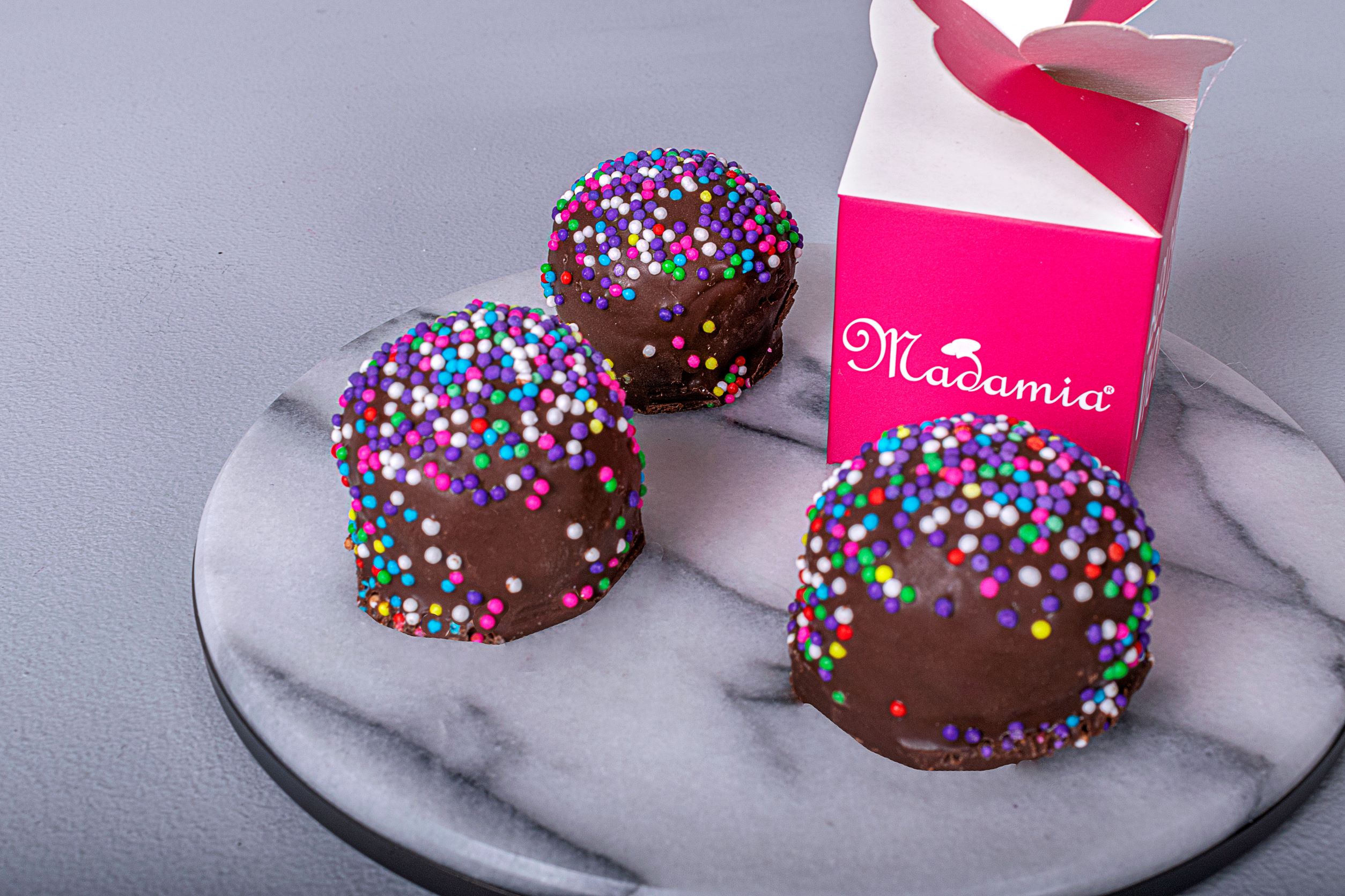 Deliciosas bolitas de torta de chocolate con suaves toques de naranja, cubiertas con chocolate y grageas de colores. Cajita x 8.