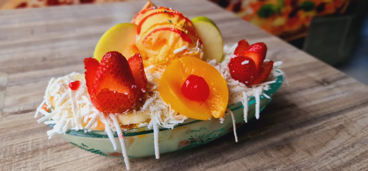 Papaya, mango, melón, banano picado, crema, queso rallado, fruta decorativa de durazno, cereza, kiwi, manzana, fresa y bola de helado.