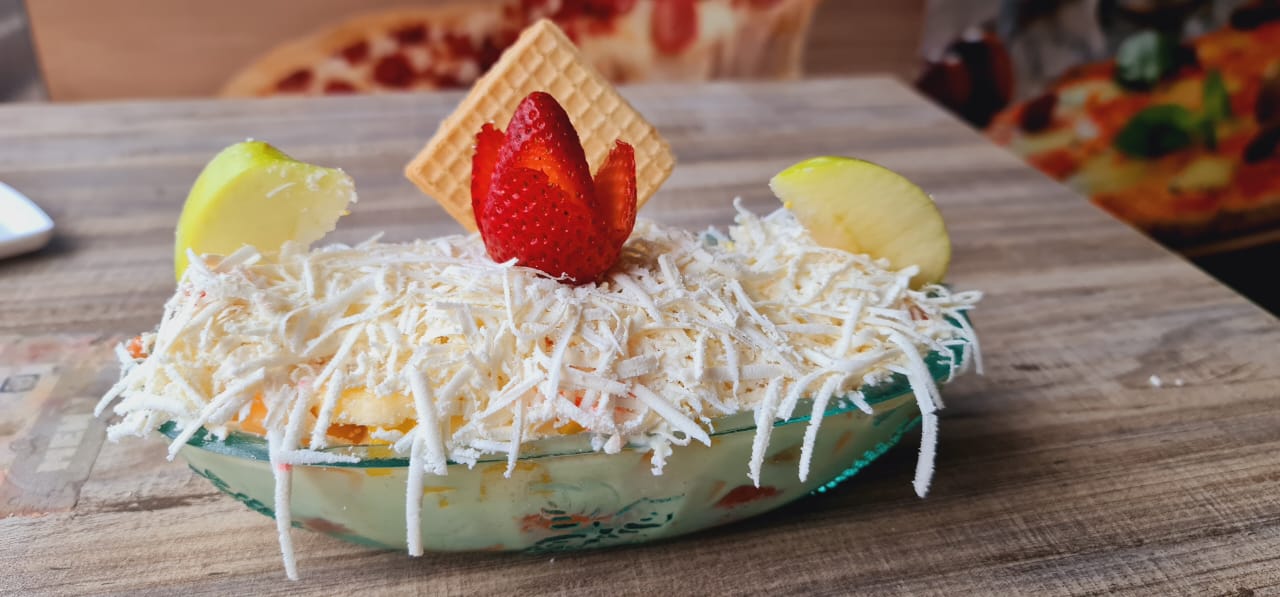 Papaya, mango, melón, banano picado, crema, queso rallado, fruta decorativa, durazno, cereza, manzana, fresa y galleta.