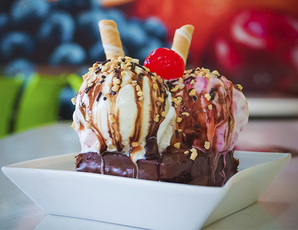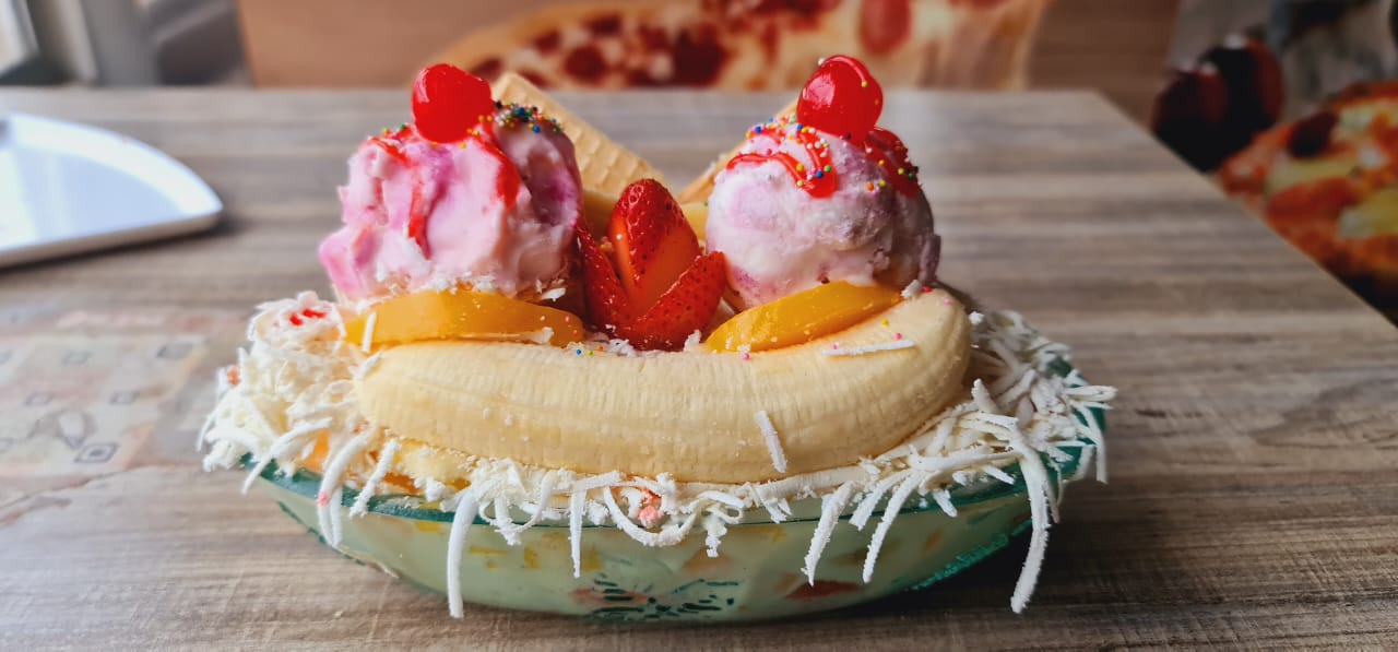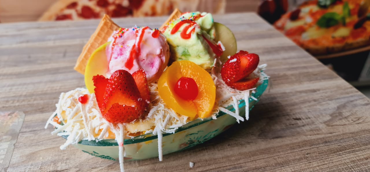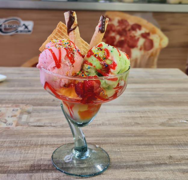 2 porciones de helado, medio platillo, crema de leche, decorada con durazno, fresa cereza.