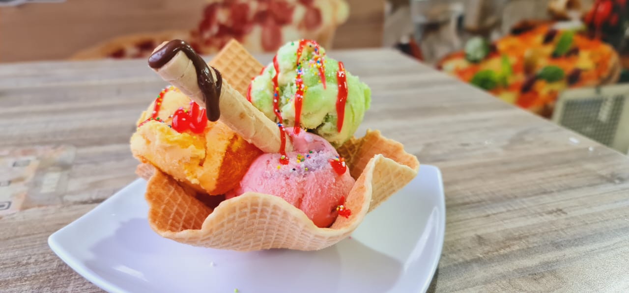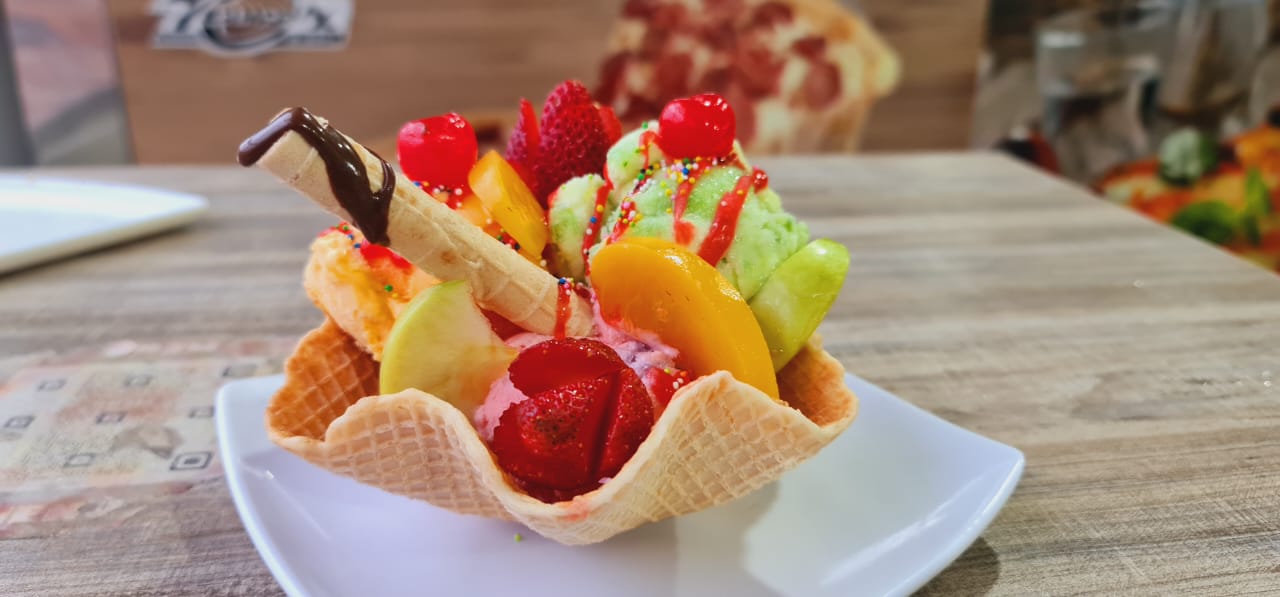 Canasta de galleta con 3 bolas de helado y salsa de la casa + durazno + fresa + cereza + galleta.