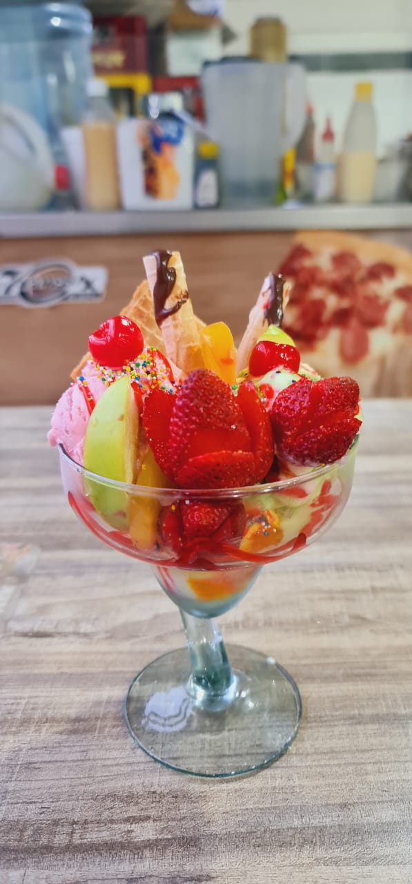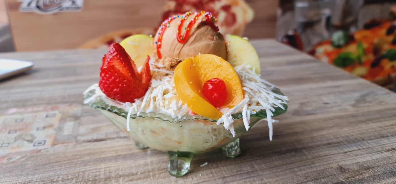 Ensalada Tropical (porcion personal ) de Aprox. 24 onzas -Fruta picada, papaya, banano, manzana, melón, fresa, crema de leche, 2 porciones de helado(segun disponibilidad ) , 1 porción de durazno y cereza.