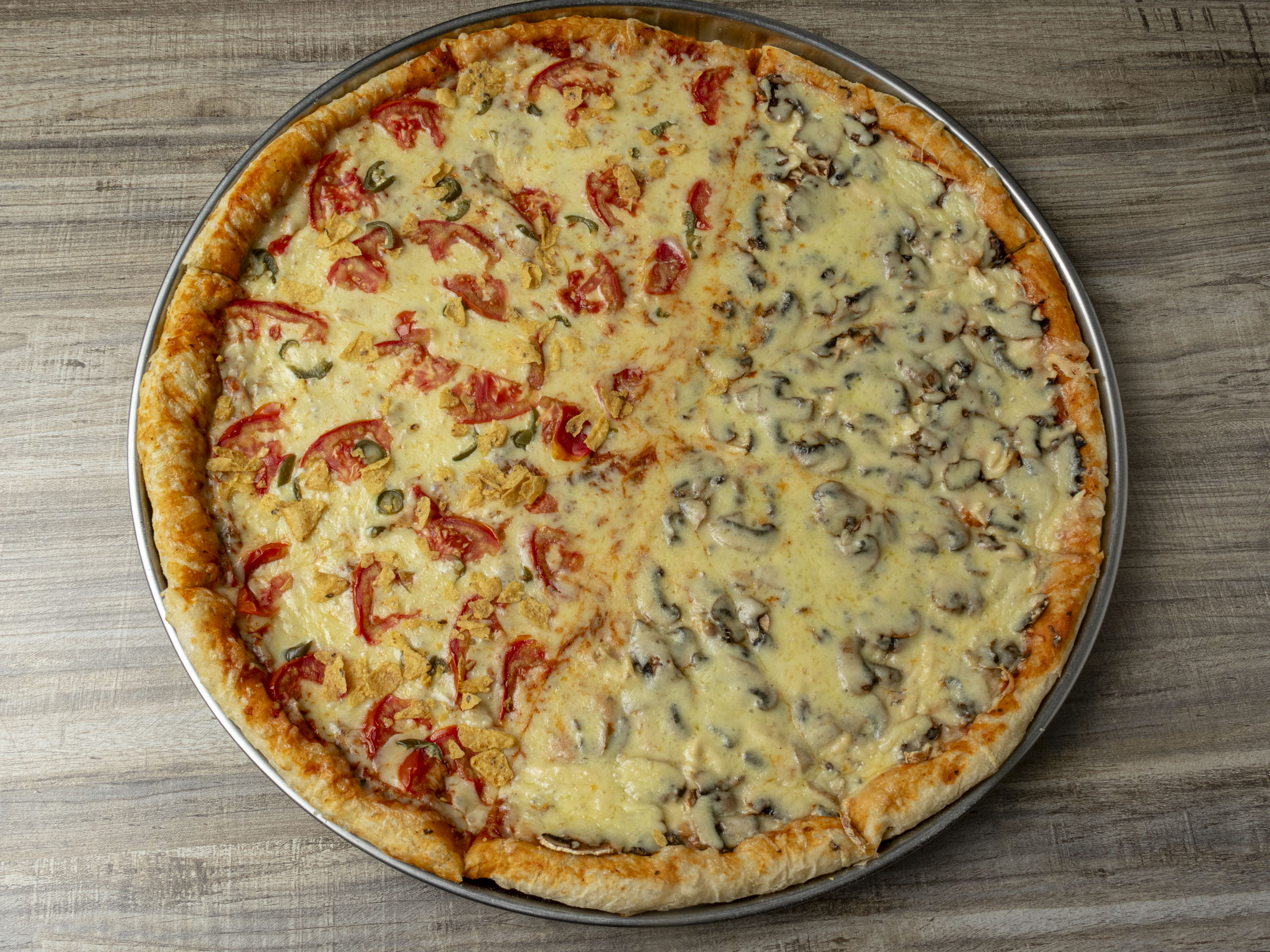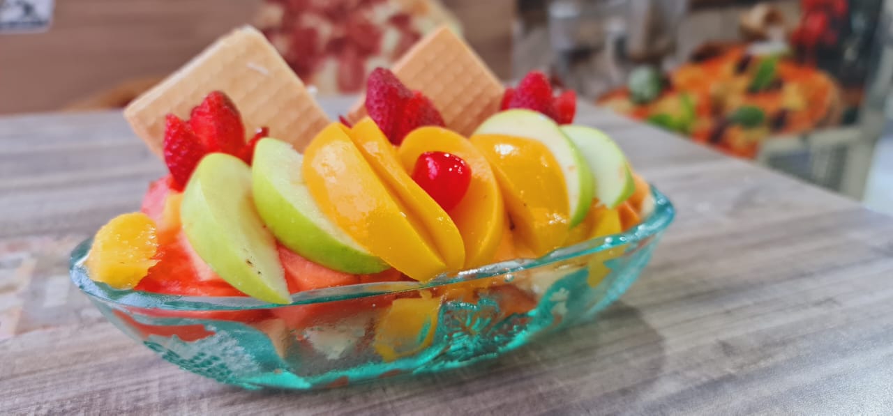 Papaya, mango, melón, banano picado, crema, queso rallado, fruta decorativa, manzana y fresa.