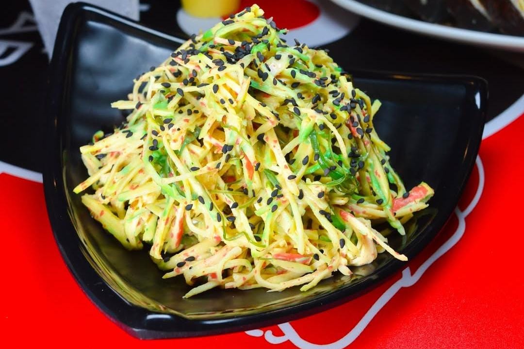 Vibrante mezcla de kanikama (cangrejo) con algas marinas, masago, ajonjolí, aderezada con nuestra rica salsa dinamita. (Picante suave). Tamaño 8 onzas.