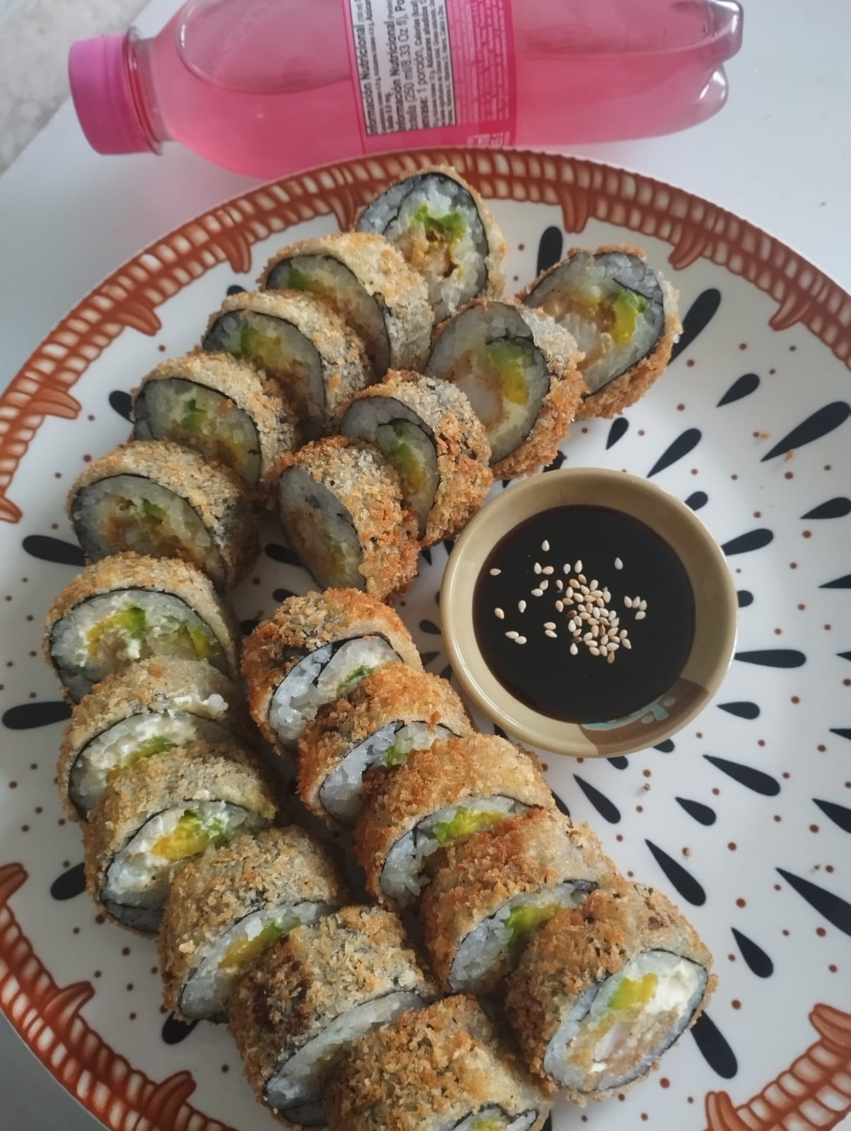 Platillo para dos personas, 20 bocados entre california roll y kani crunch más 4 langostinos apanados, 2 gaseosas de 250 ml, 2 palitos y salsas.