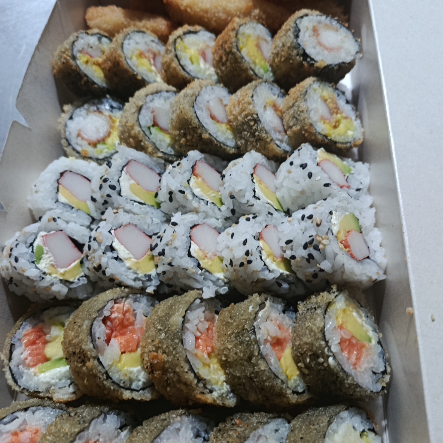 5 Philadelphia, 5 california, 5 ebi crunch, 5 salmón skin, 10 piezas de palmito de cangrejo apanado. 2 Palitos chinos y salsas.