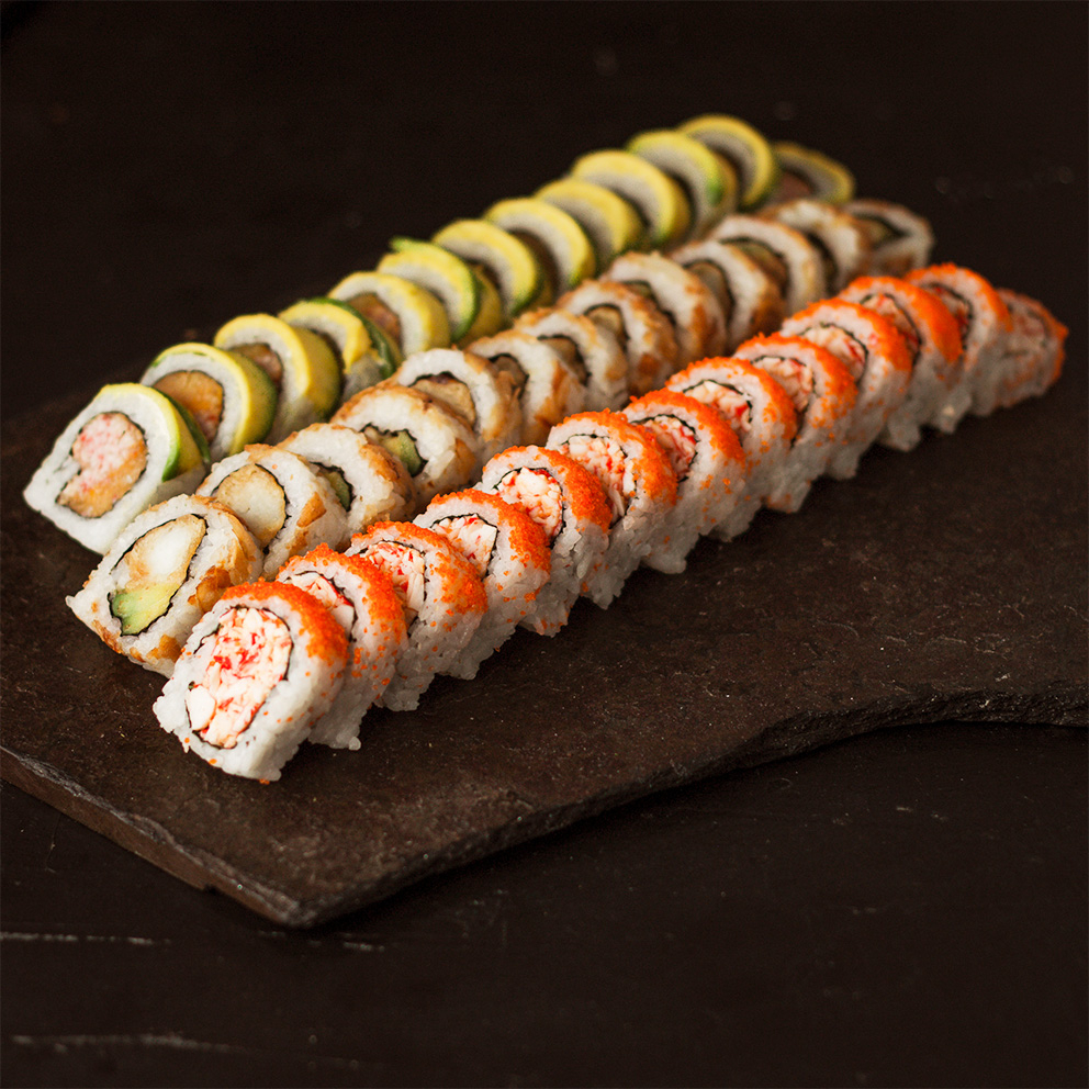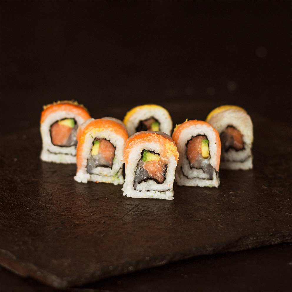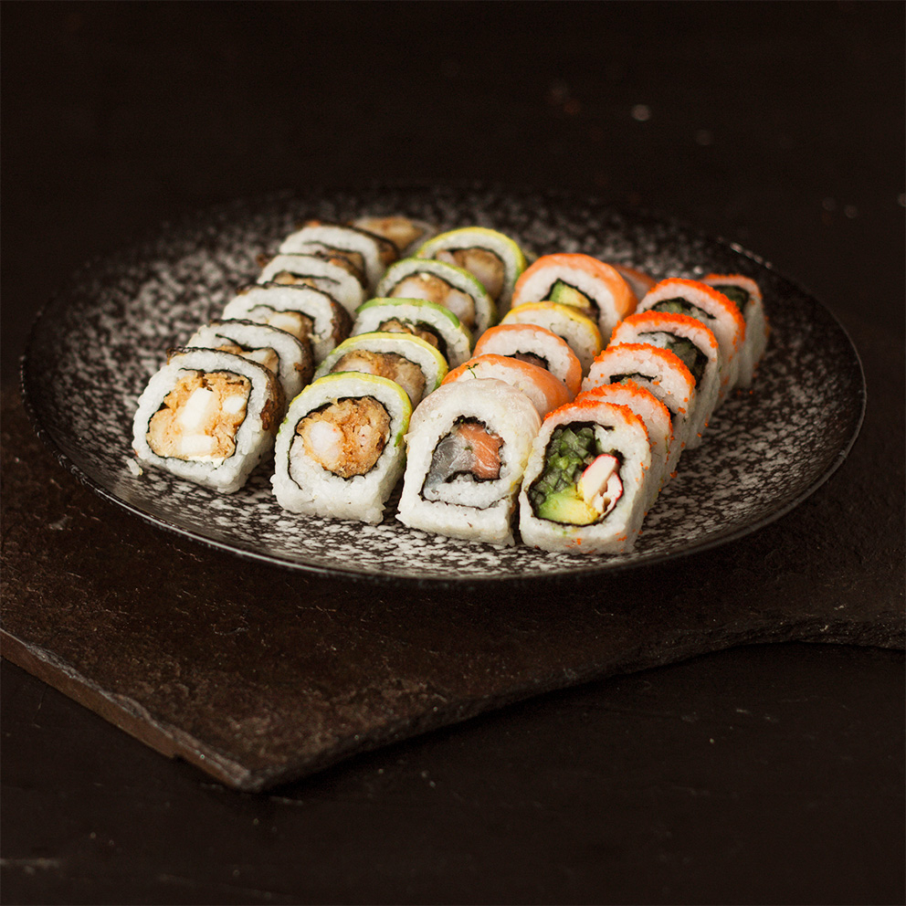 24 bocados: california roll, arcoiris roll, ebi tempura roll y nippori roll.