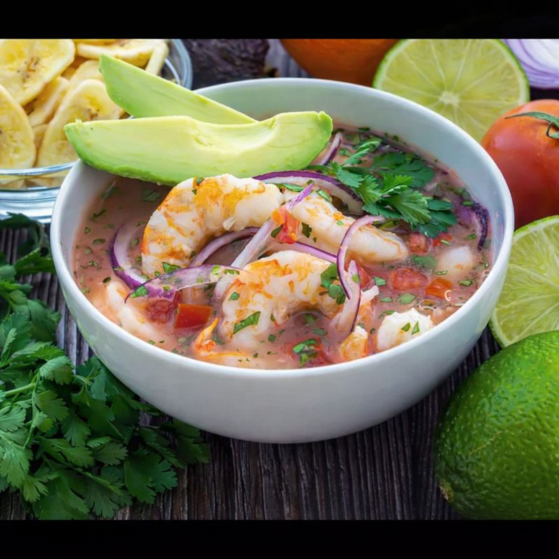 100gr de camarón escalfado, vegetales en juliana, pimentón, cebolla roja, cilantro, maíz, limón, salsa de tomate, con un toque de sal, acompañado de aguacate y ajonjolí.