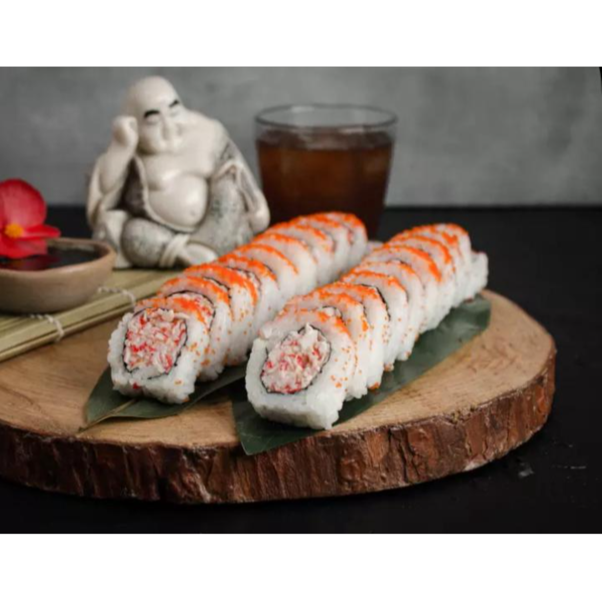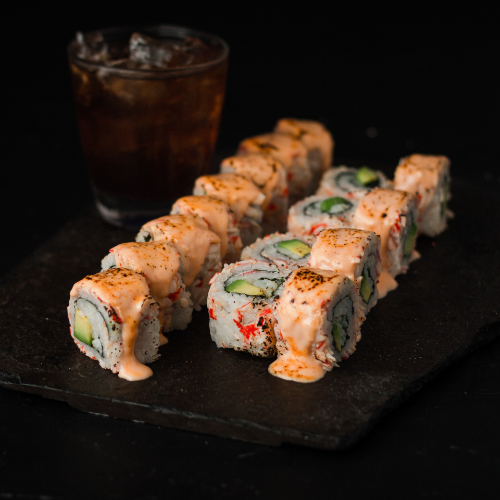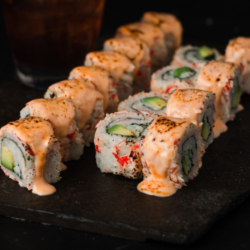 Rollo relleno de pescado blanco tempurizado y aguacate.Topping de pasta dinamita y salsa acevichada ligeramente picante. 24 bocados + té de la casa 300ml.