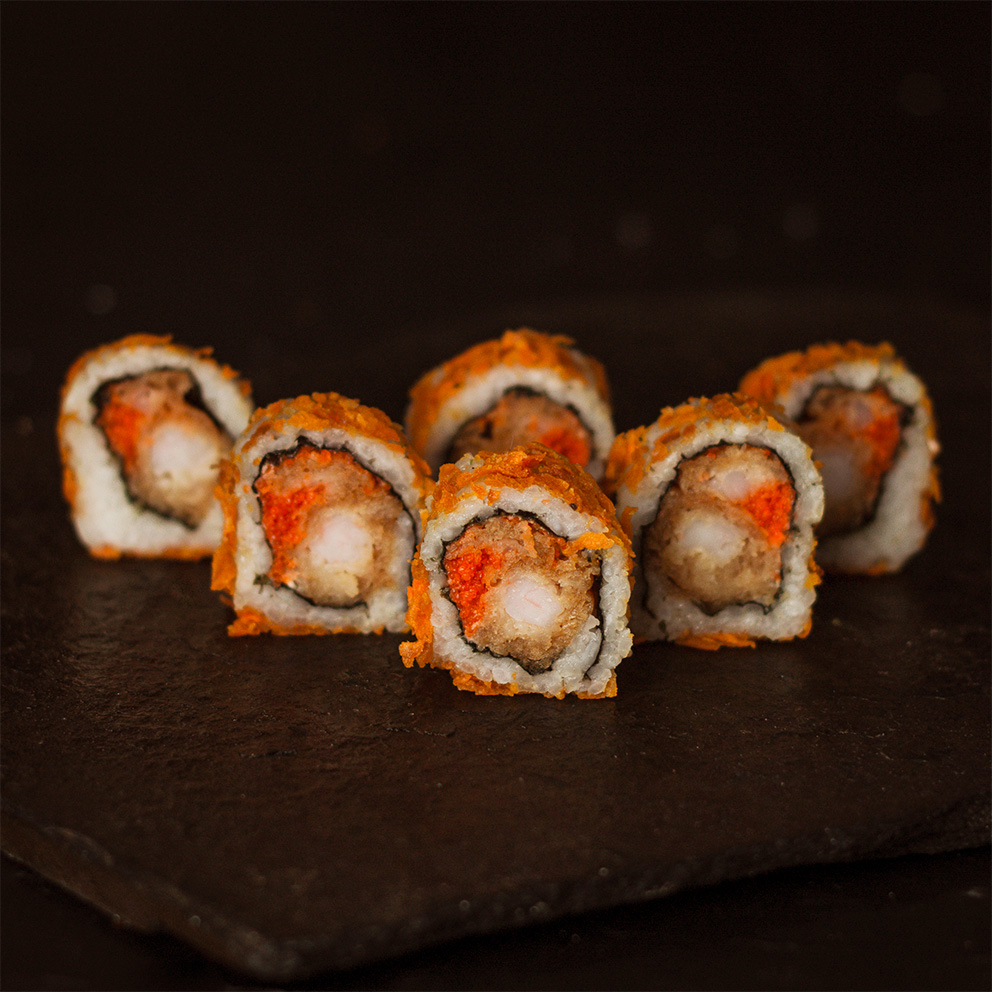 Rollo relleno de camarón tempurizado y queso crema. Topping de zanahoria crispy.12 bocados.