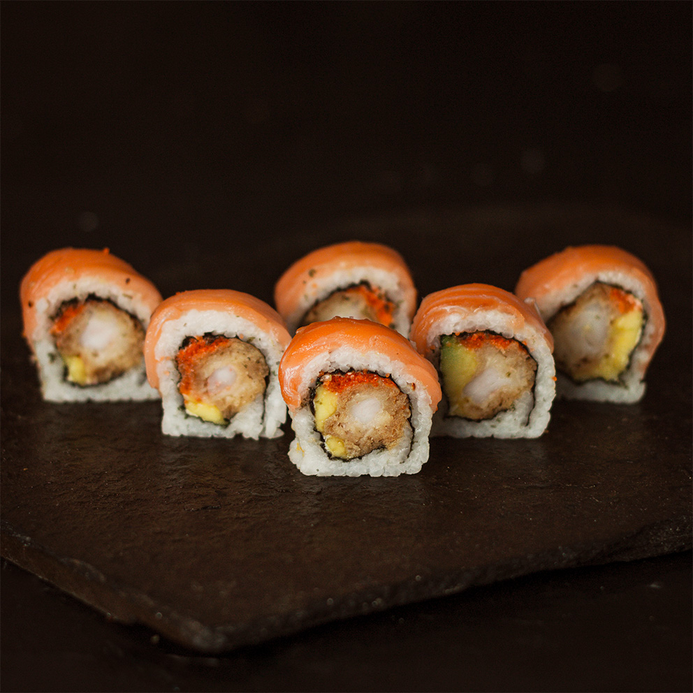 Rollo relleno de camarón tempurizado y aguacate. Topping de salmón fresco.12 bocados.