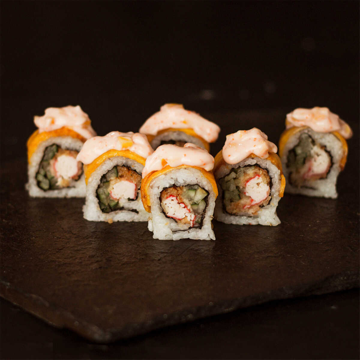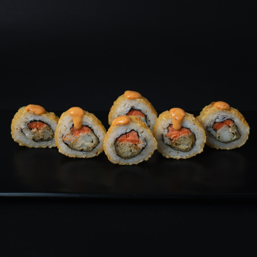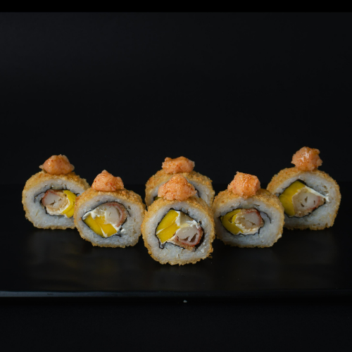 Rollo apanado, relleno de palmito crispy, queso crema y mango. Topping de pasta dinamita y salsa maracuyá. 12 Bocados.