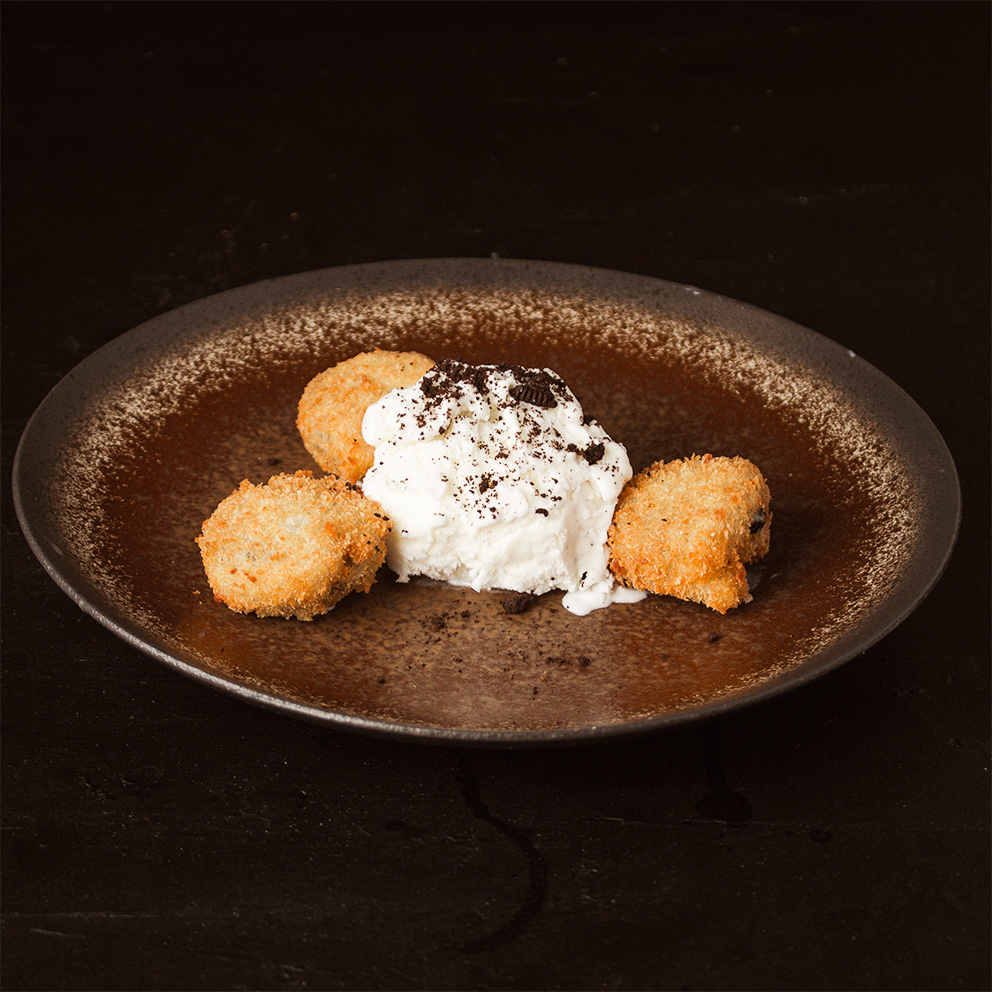 3 Unidades de galleta oreo apanadas, rellenas de queso crema, acompañadas de helado.