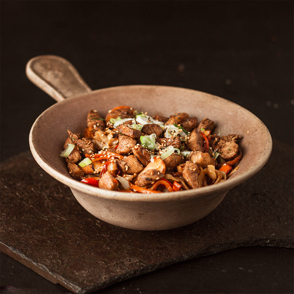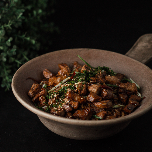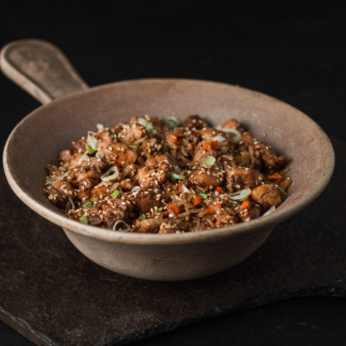 Arroz salteado al wok con pollo, mix de vegetales, con cilantro, salsa teriyaki y ajonjolí, 350gr.