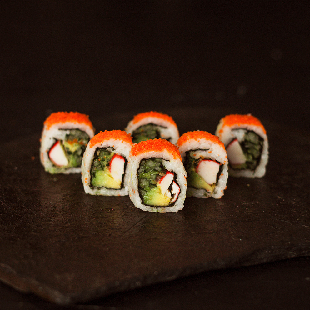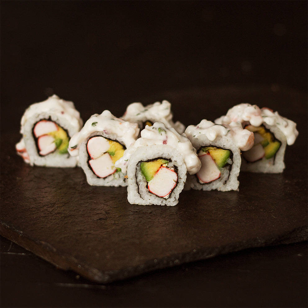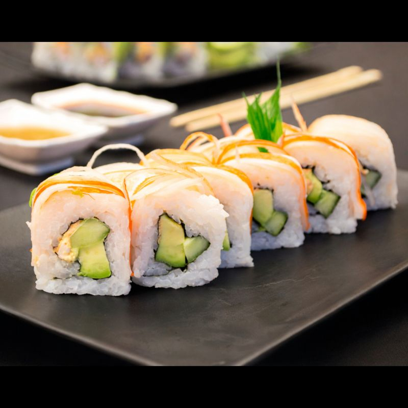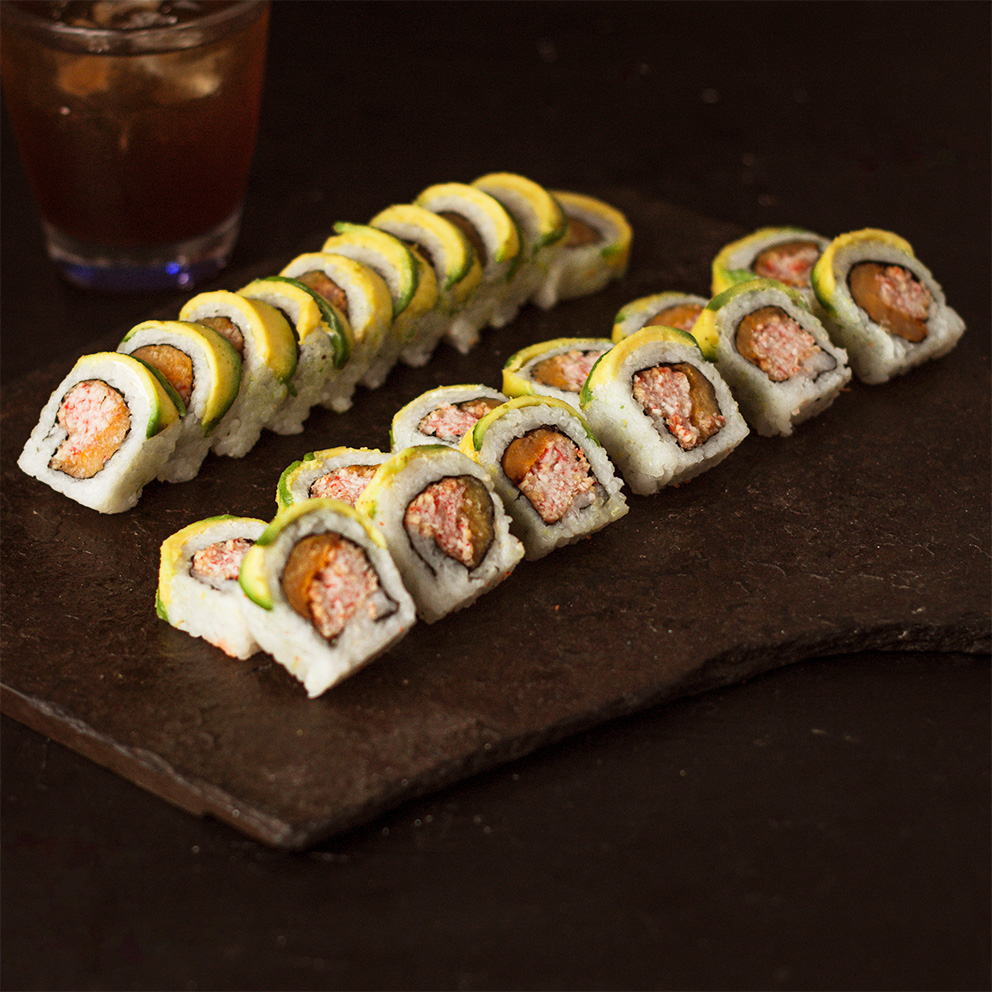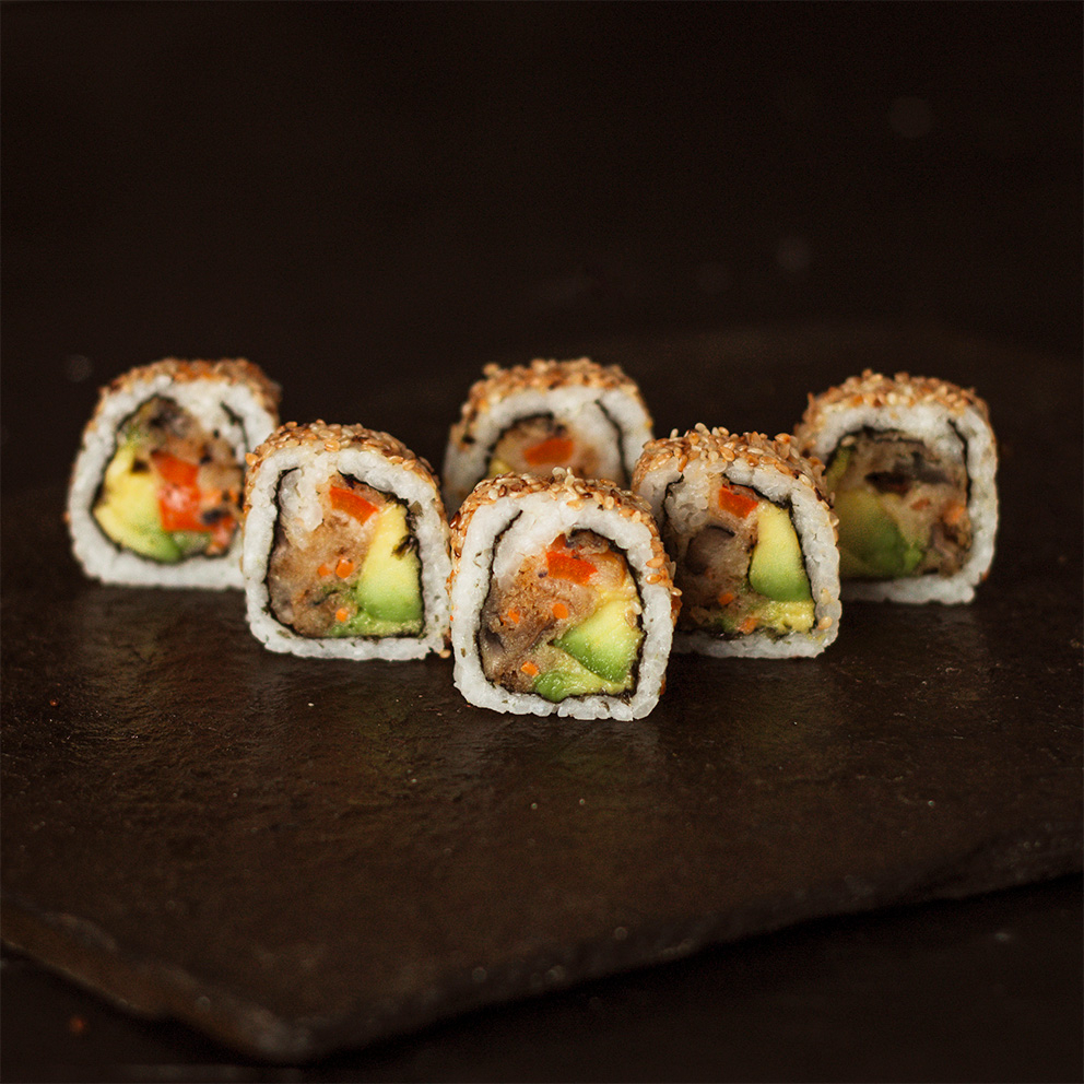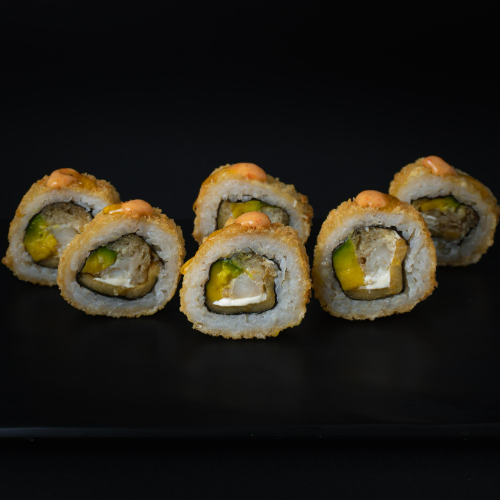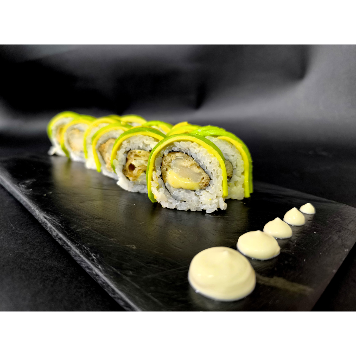 Rollo relleno de pescado blanco tempurizado y salsa Fuji. Topping de aguacate.12 bocados.