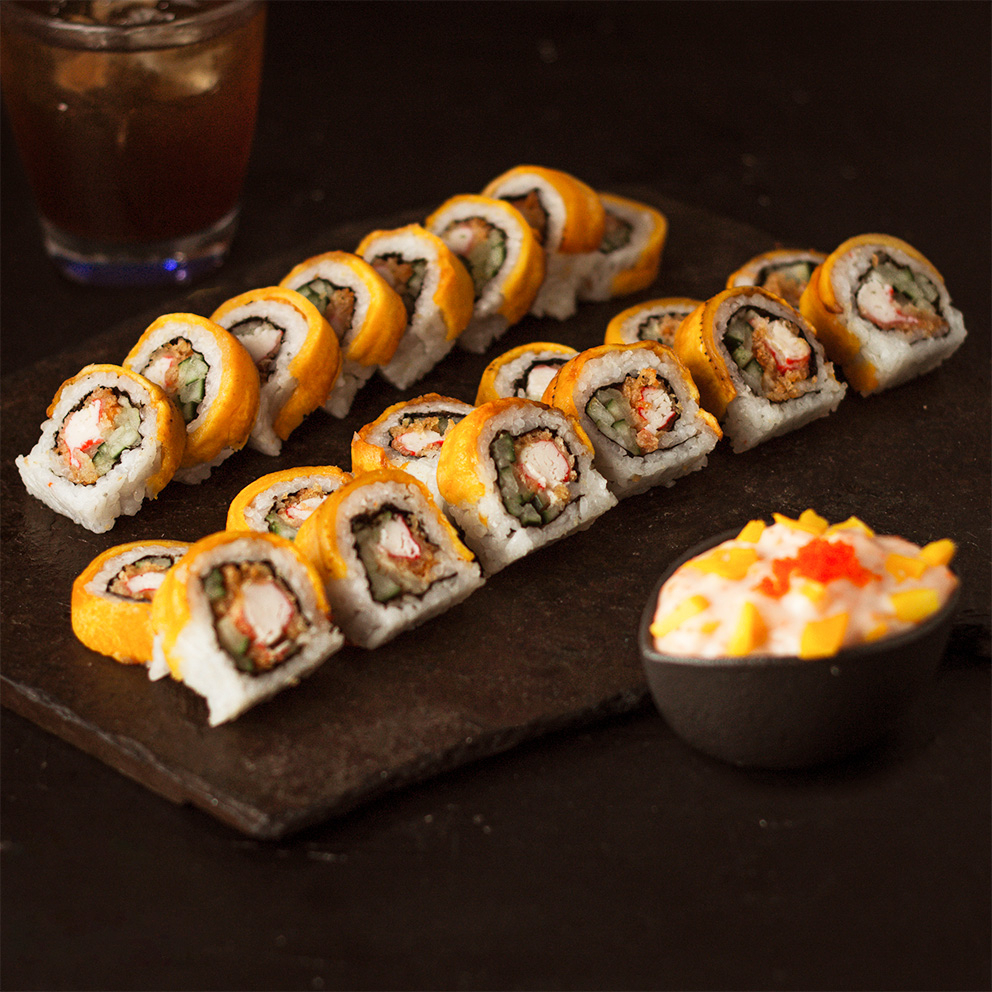 Rollo apanado, relleno de camarón tempurizado, queso crema, aguacate y plátano maduro. Topping de salsa maracuyá. 12 Bocados.
