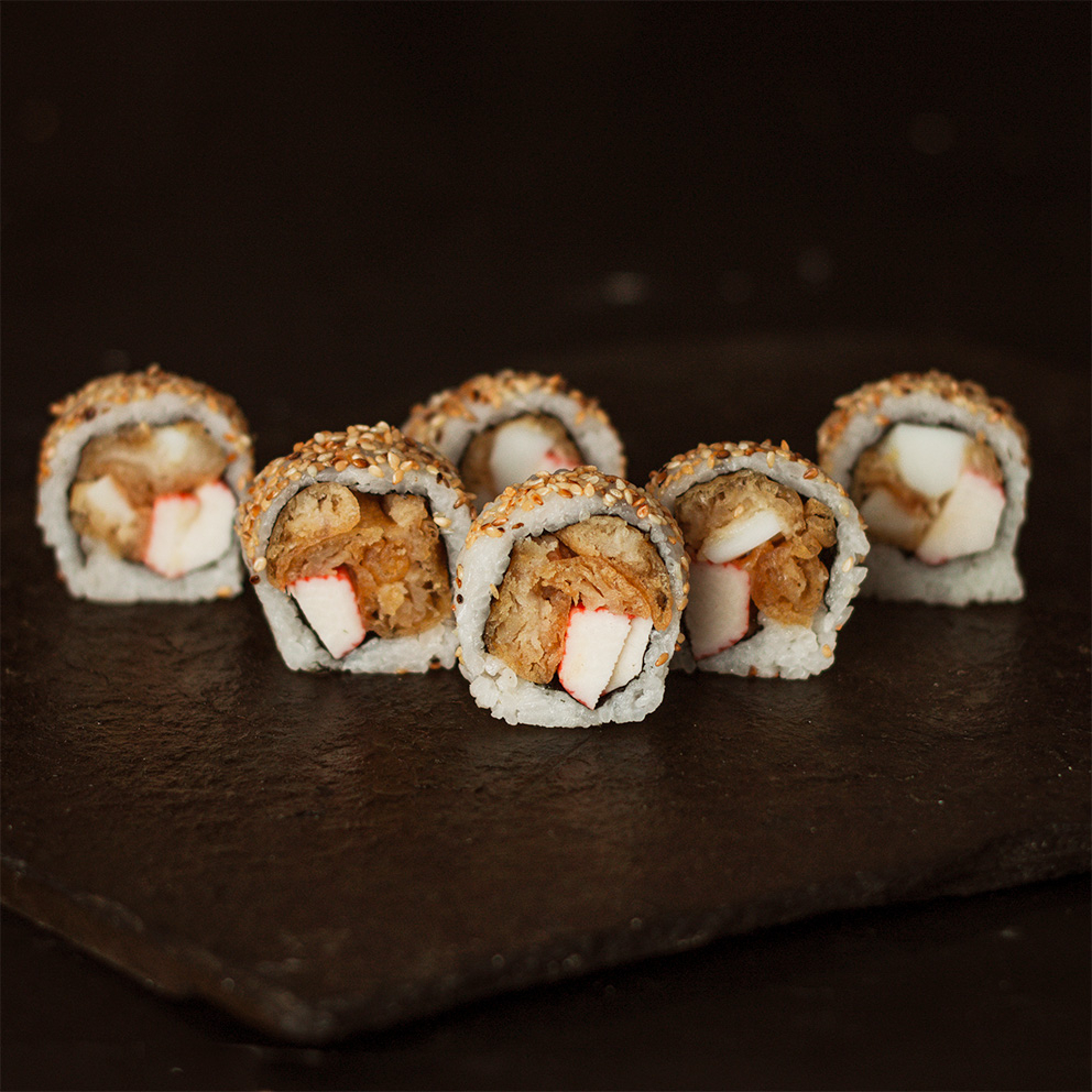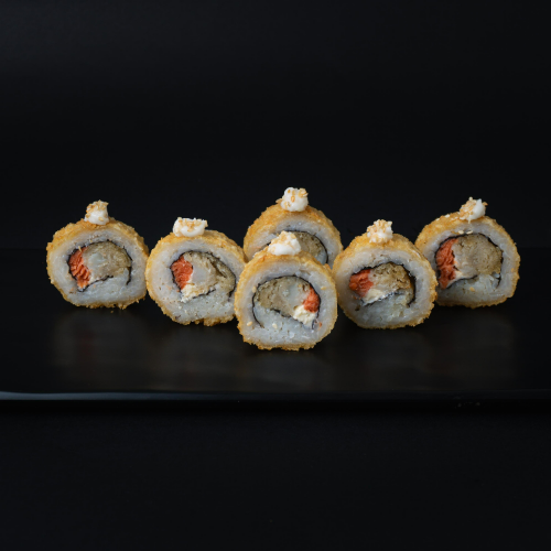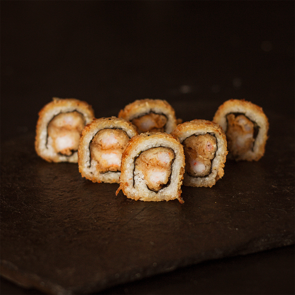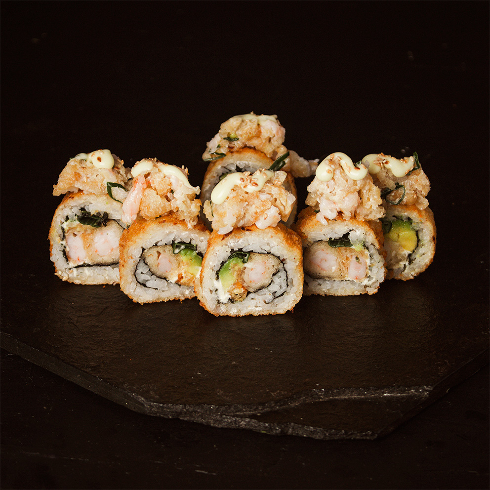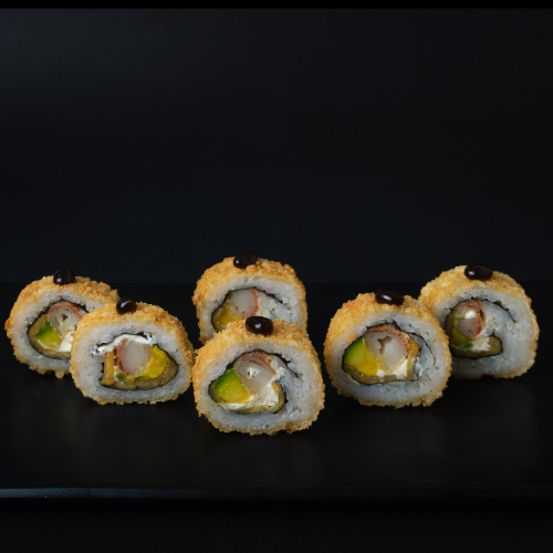 Rollo tempurizado, relleno de pescado blanco tempura y queso crema.12 bocados.