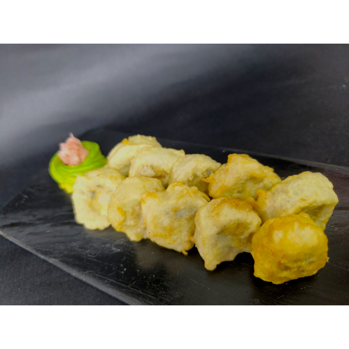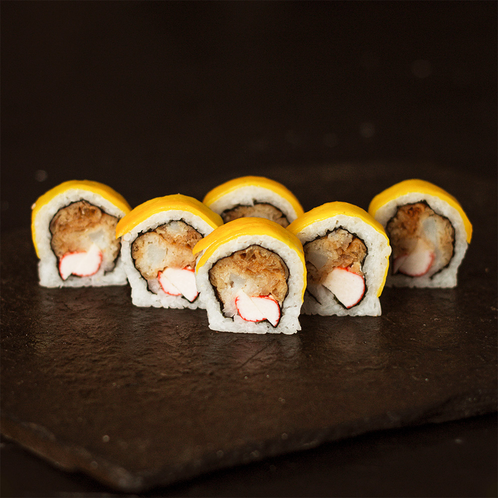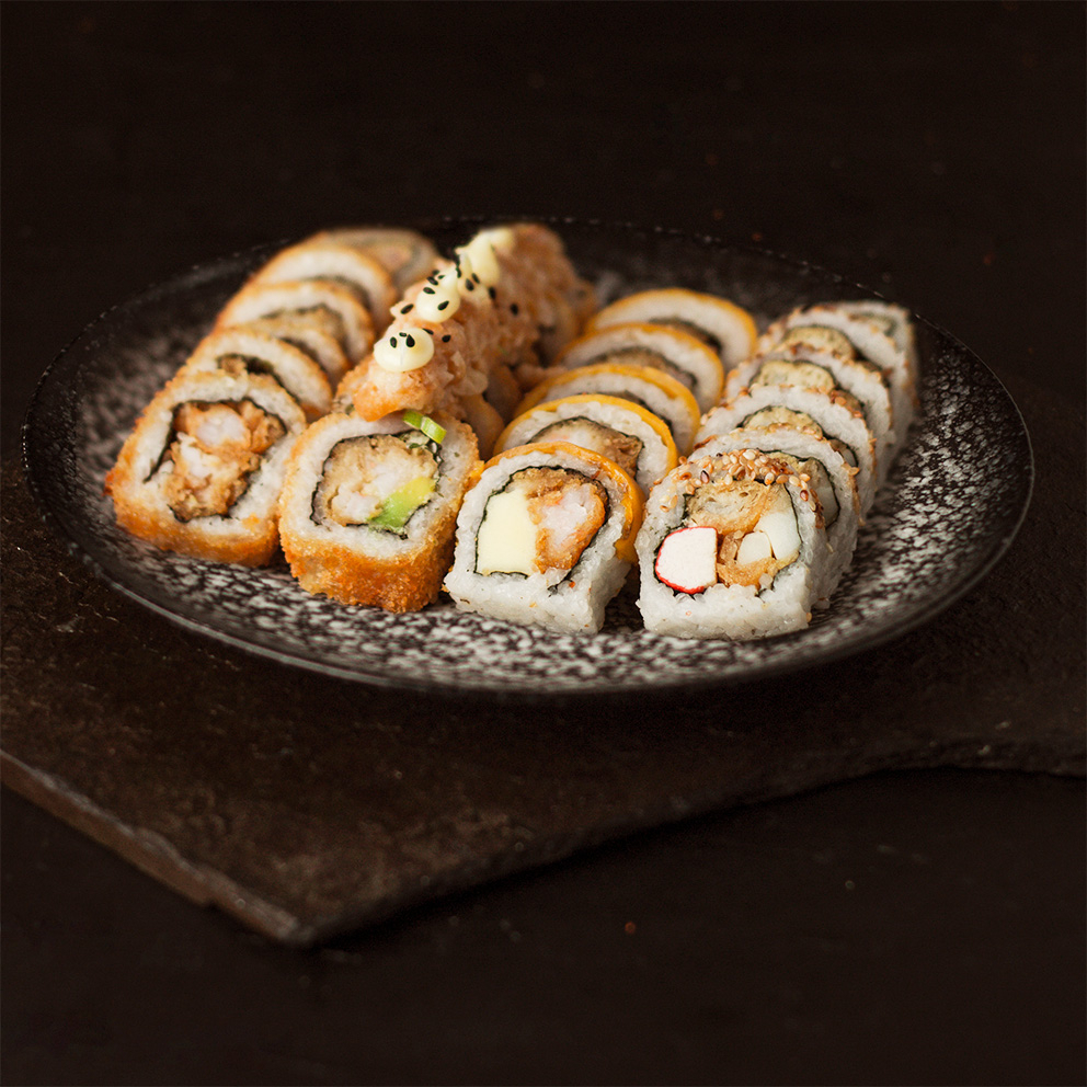 Rollo tempurizado, relleno de pescado blanco tempura y queso crema.12 bocados.