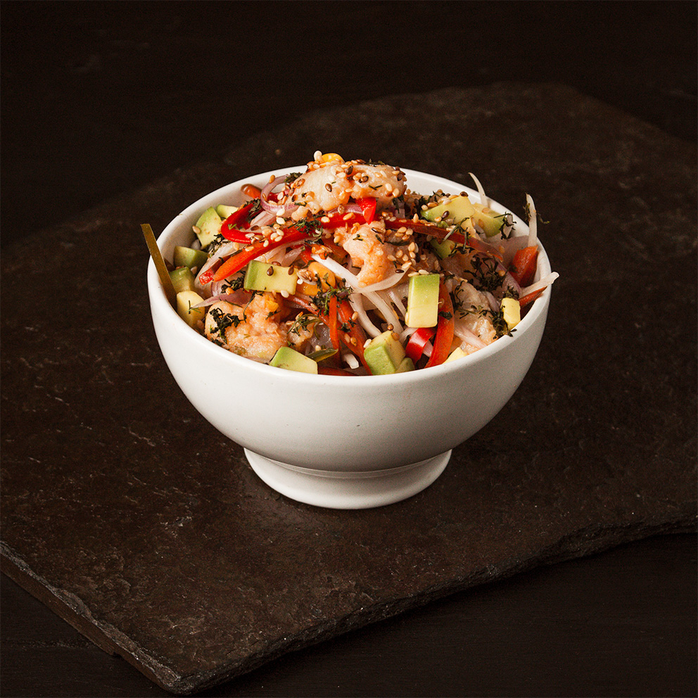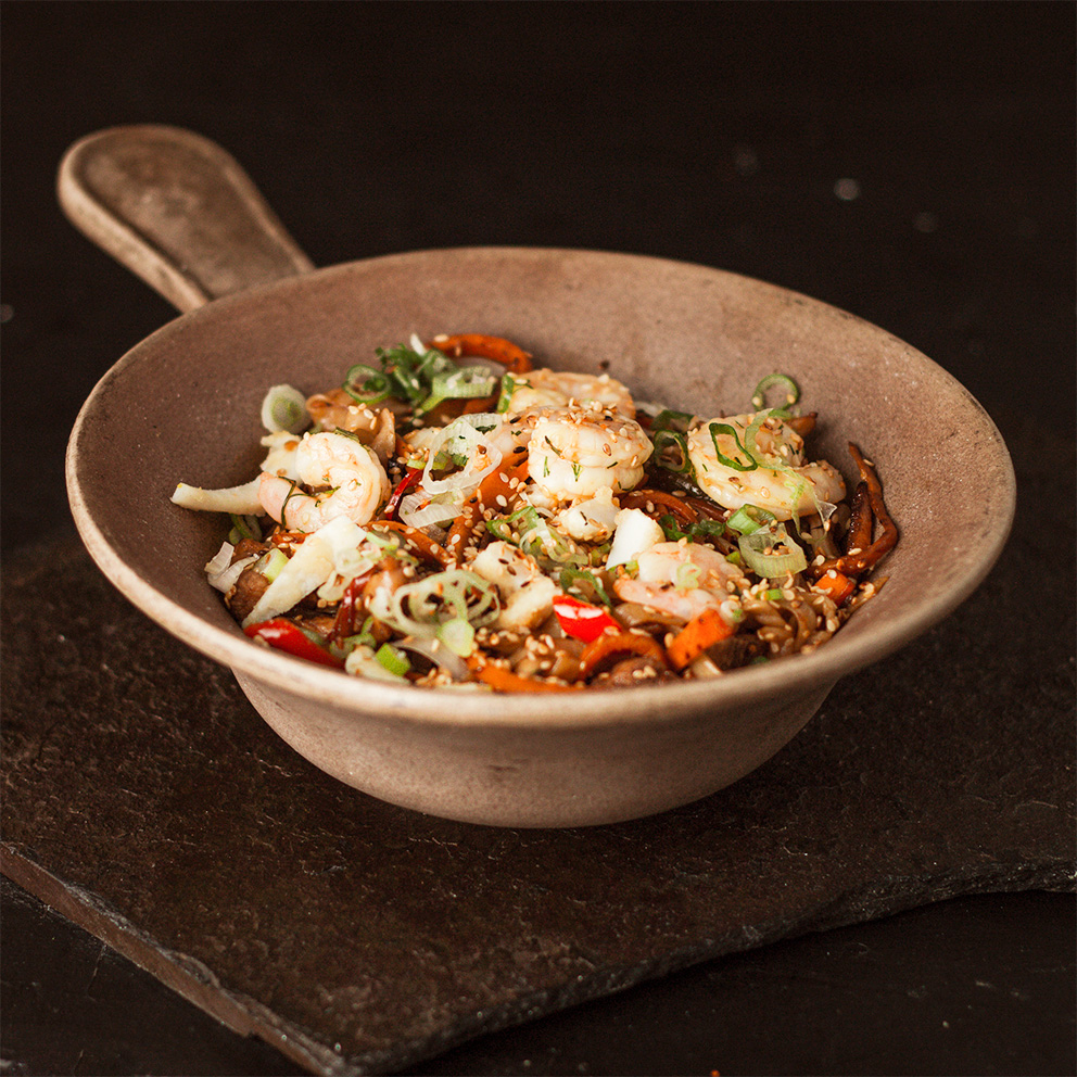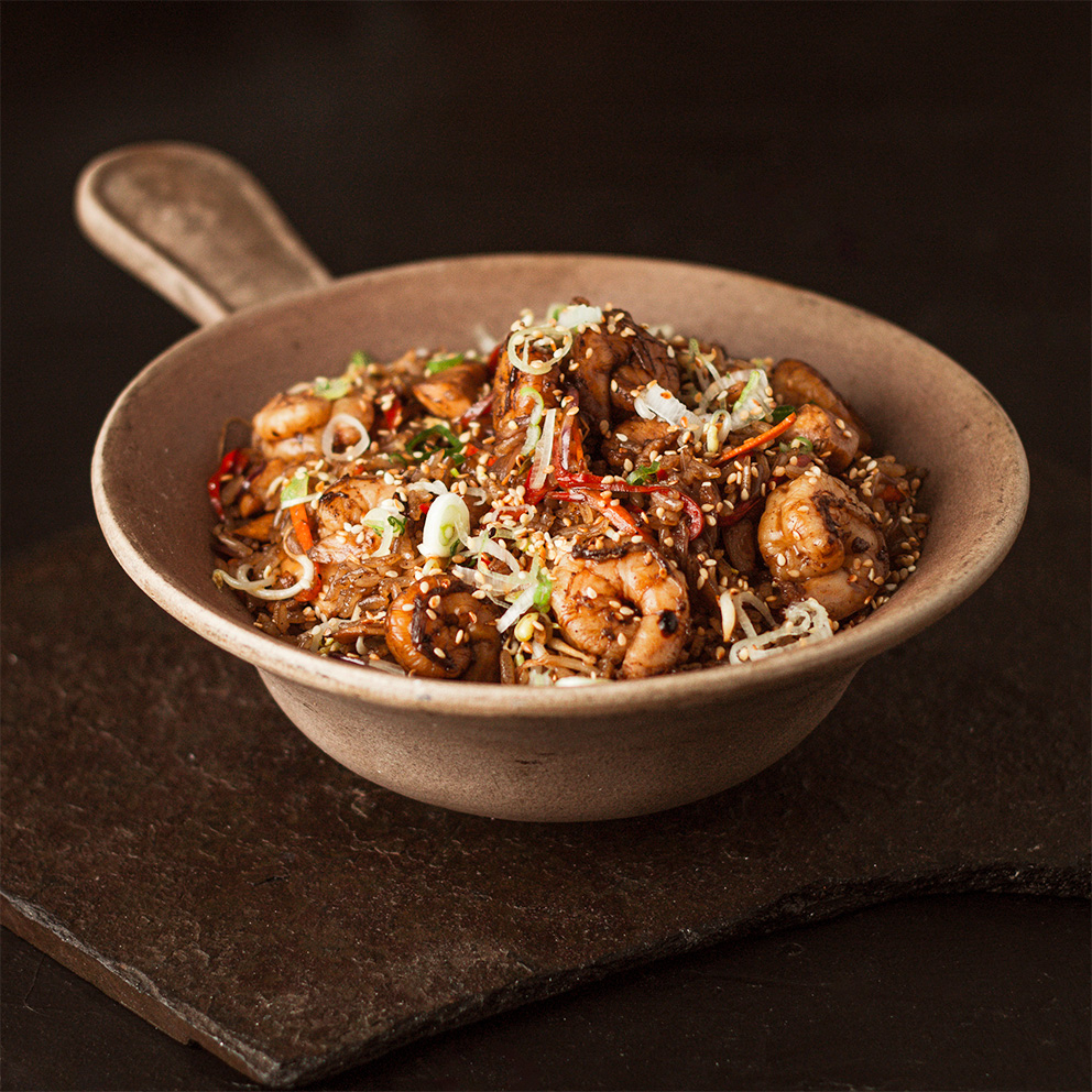 Tallarines salteados al wok con camarón, calamar,mix de vegetales en juliana, con cilantro y ajonjolí tostado. 500gr.