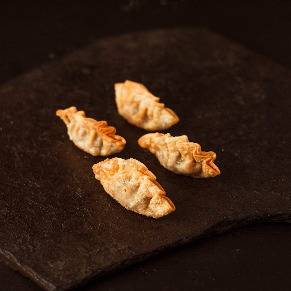 Rollo relleno de palmito crispy y pepino. Topping de plátano frito con salsa tropical de mango. 24 bocados del mismo sabor + té de la casa 300ml.