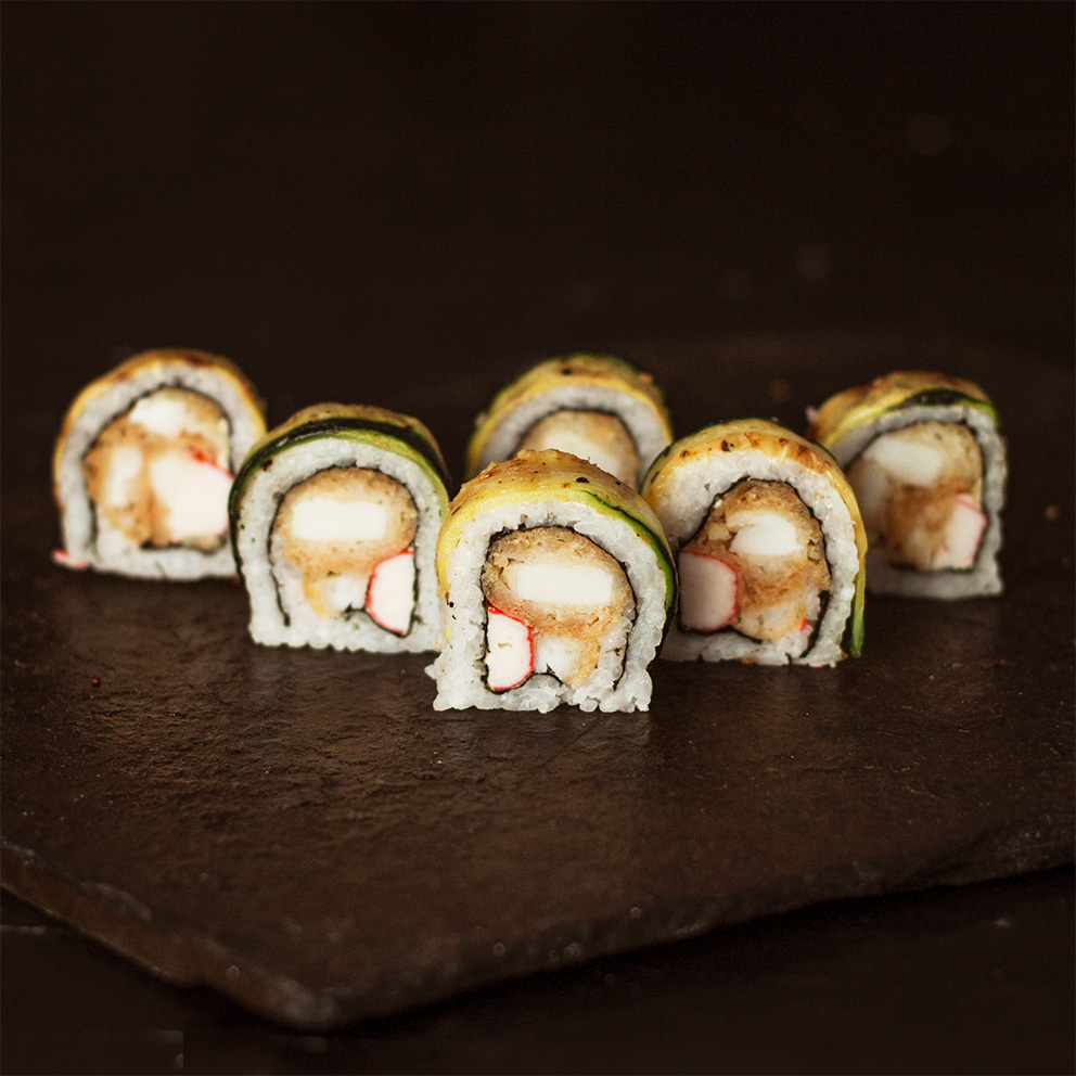 Rollo relleno de palmito crispy y calamar tempurizado. Topping de zucchini grillado.12 bocados.