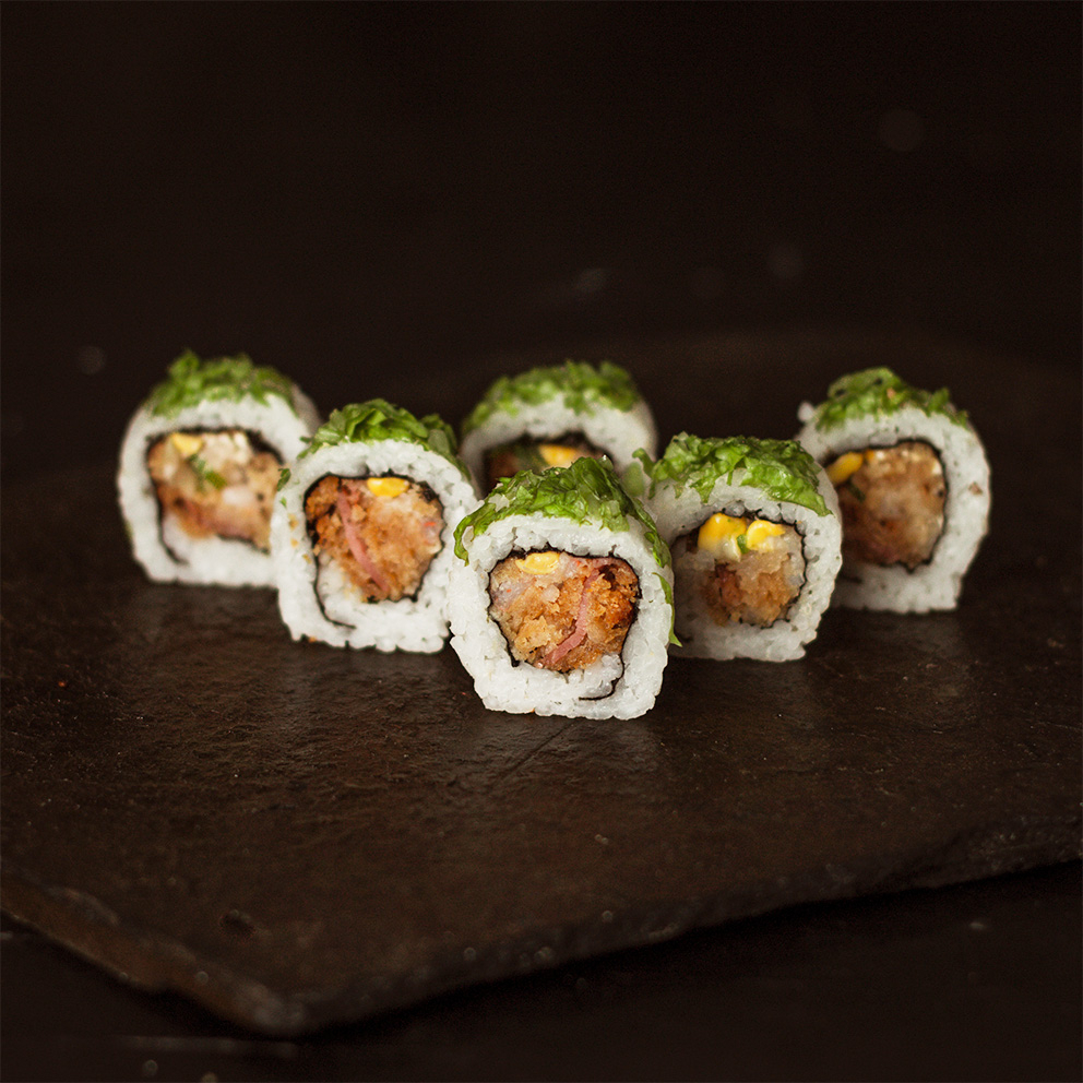 Rollo relleno de una mezcla de tocineta crispy, maíz, queso crema y camarón tempurizado, topping de salsa fuji con lechuga, 12 bocados.