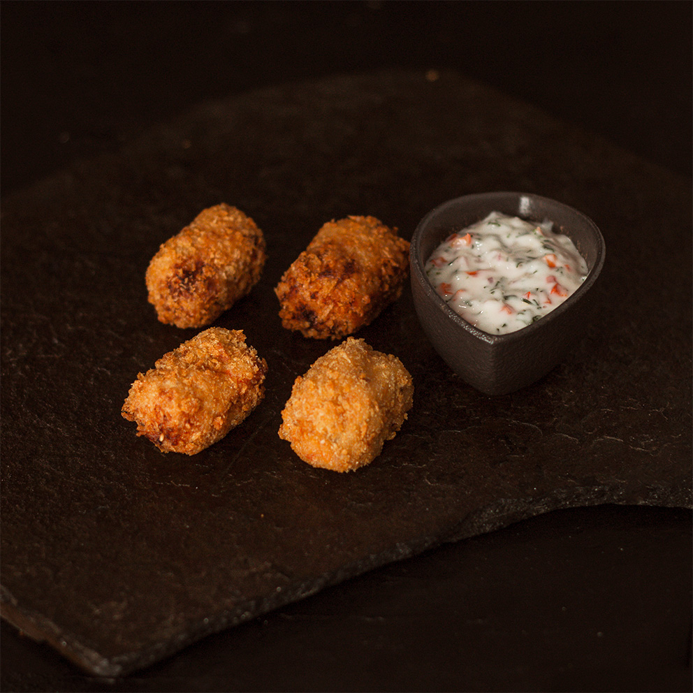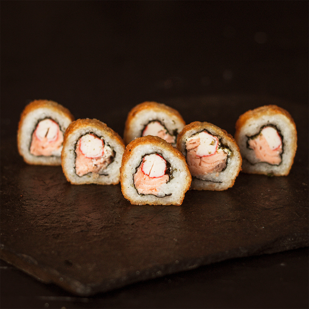 Rollo apanado, relleno de salmón crispy, palmito fresco y queso crema.12 bocados.