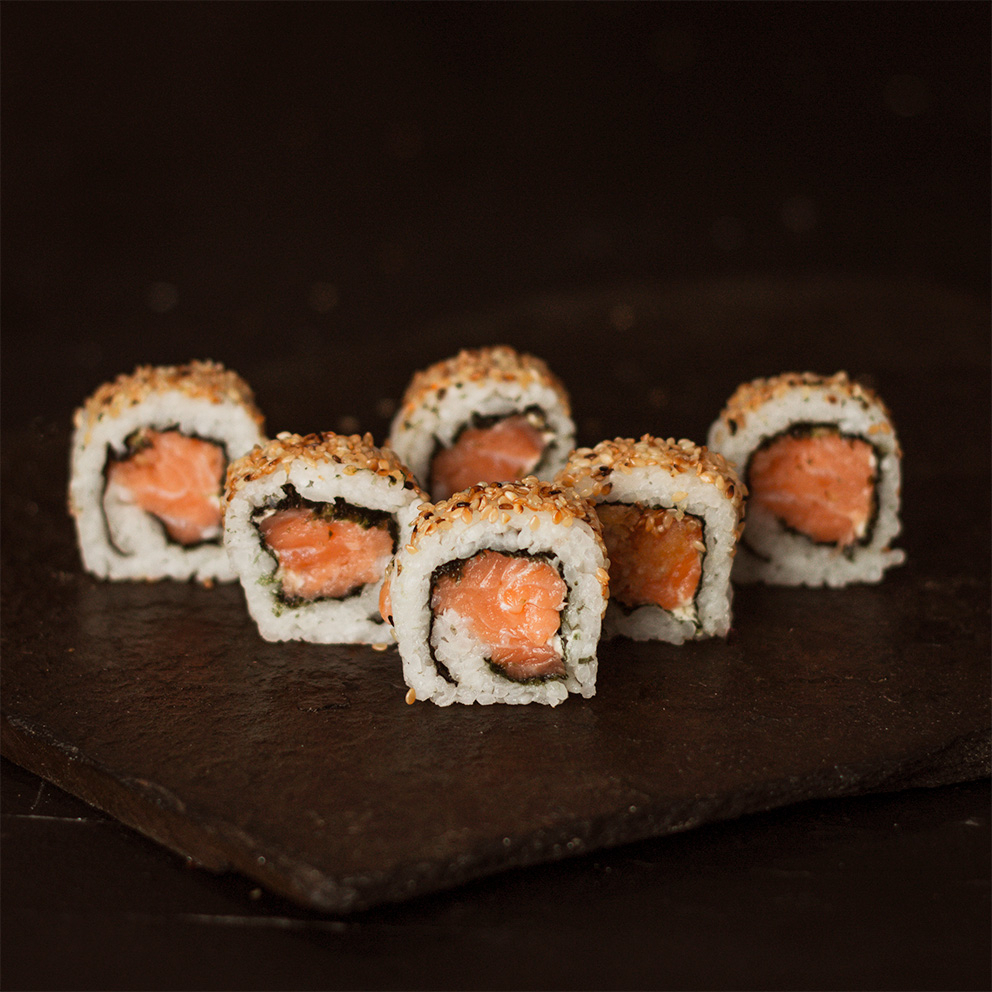 Rollo relleno de salmón fresco y queso crema. Topping de ajonjolí.12 bocados.