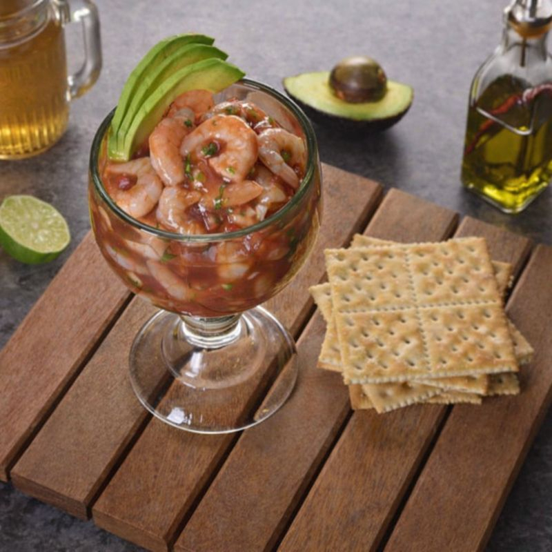Mezcla de camarón escalfado 200gr, salsa de tomate, mayonesa, limón, cebolla roja picada en cuadritos pequeños, un toque de sal, acompañado de aguacate y ajonjolí.