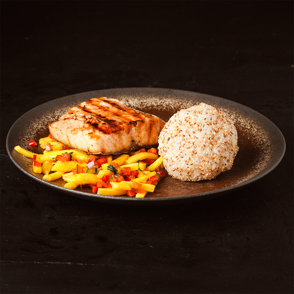 180gr de salmón grillado, bola de arroz de sushi abrazada con ajonjolí, acompañado de una ensalada agridulce de mango y vegetales.