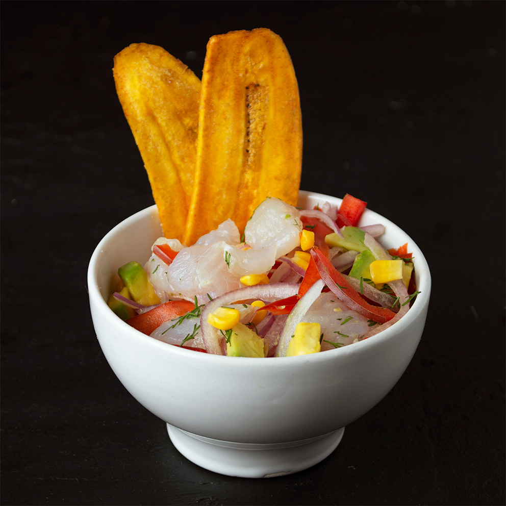 100gr de pescado blanco fresco, 100gr de camarón escalfado, vegetales en juliana, pimentón, cebolla roja, maíz, cilantro, limón, salsa de tomate, con un toque de sal, acompañado de aguacate y ajonjolí.