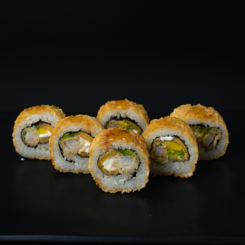 Rollo apanado, relleno de palmito crispy, aguacate, queso crema y plátano maduro. Topping de reducción de salsa teriyaki. 12 Bocados.