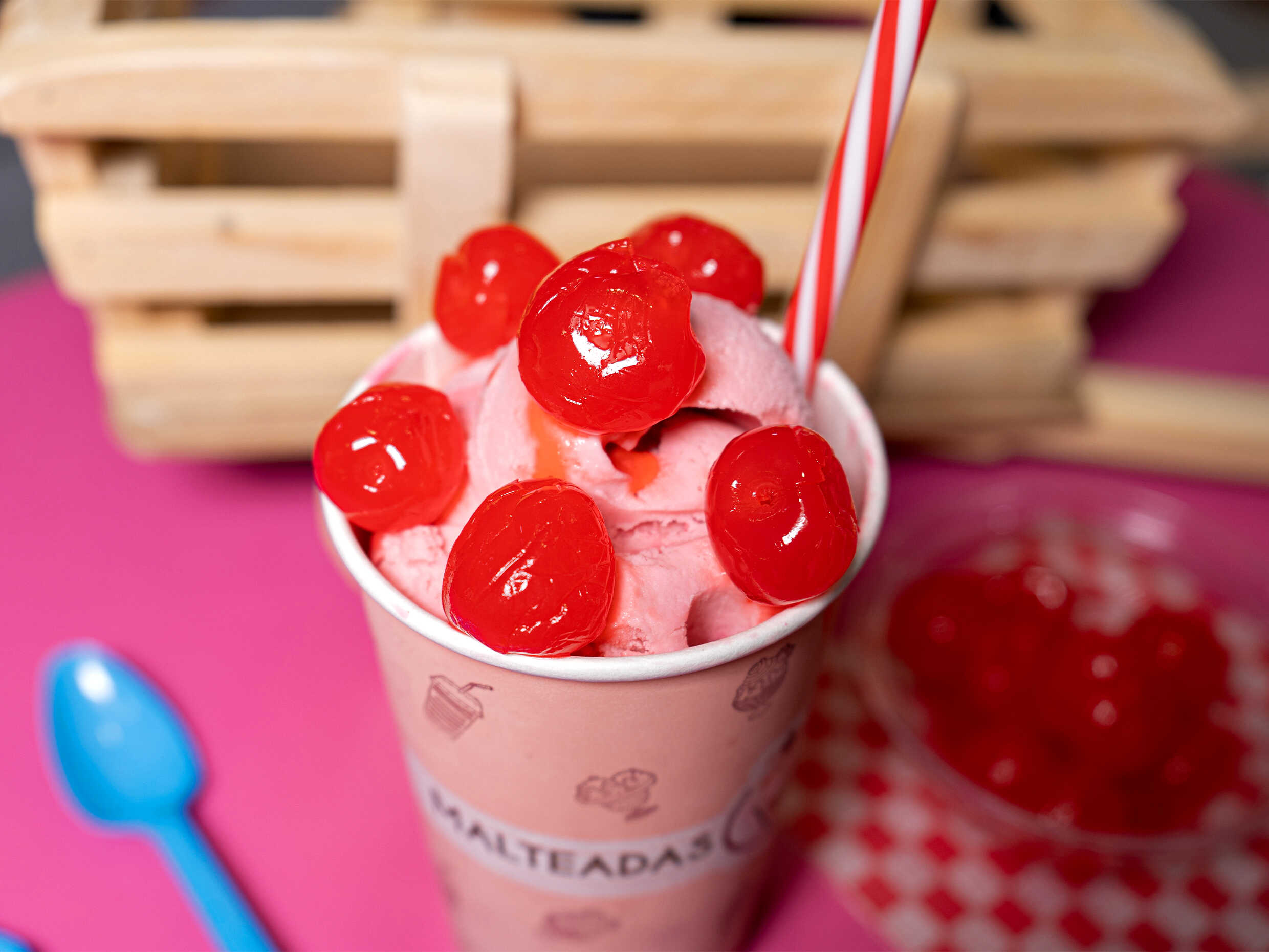 Cereza confitadas mezcladas con helado de cereza y uva decorado con salsa de cereza. Te llegara una malteada de 16onz.
