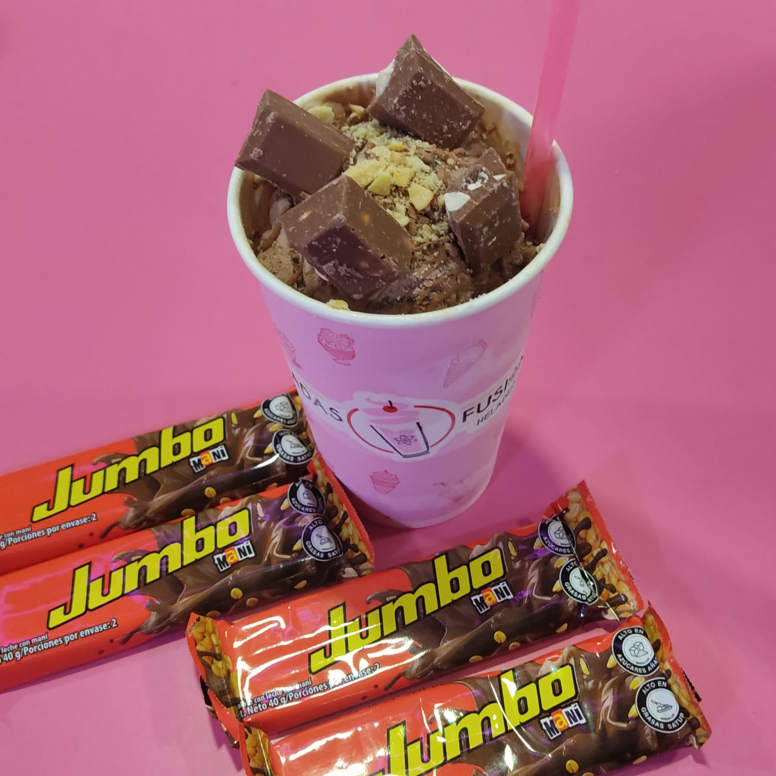 Trozos de chocolatina jumbo maní fusionados con helado de chocolate y nata de maní, decorada con salsa de chocolate.