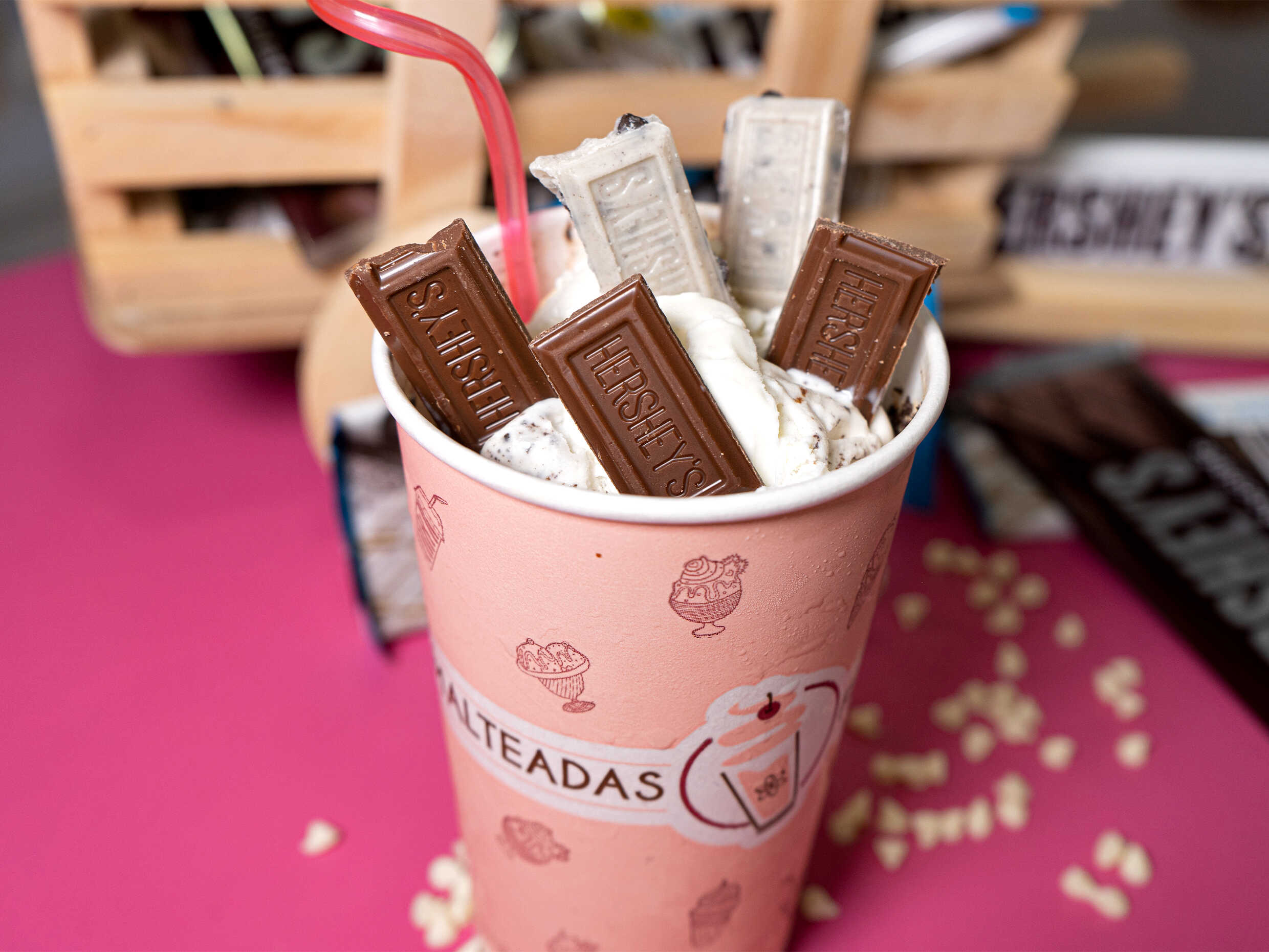 Trozos de chocolatina hershey´s blanca mezclados con helado de vainilla y tres leches con salsa de chocolate. Te llegara una malteada de 16onz.