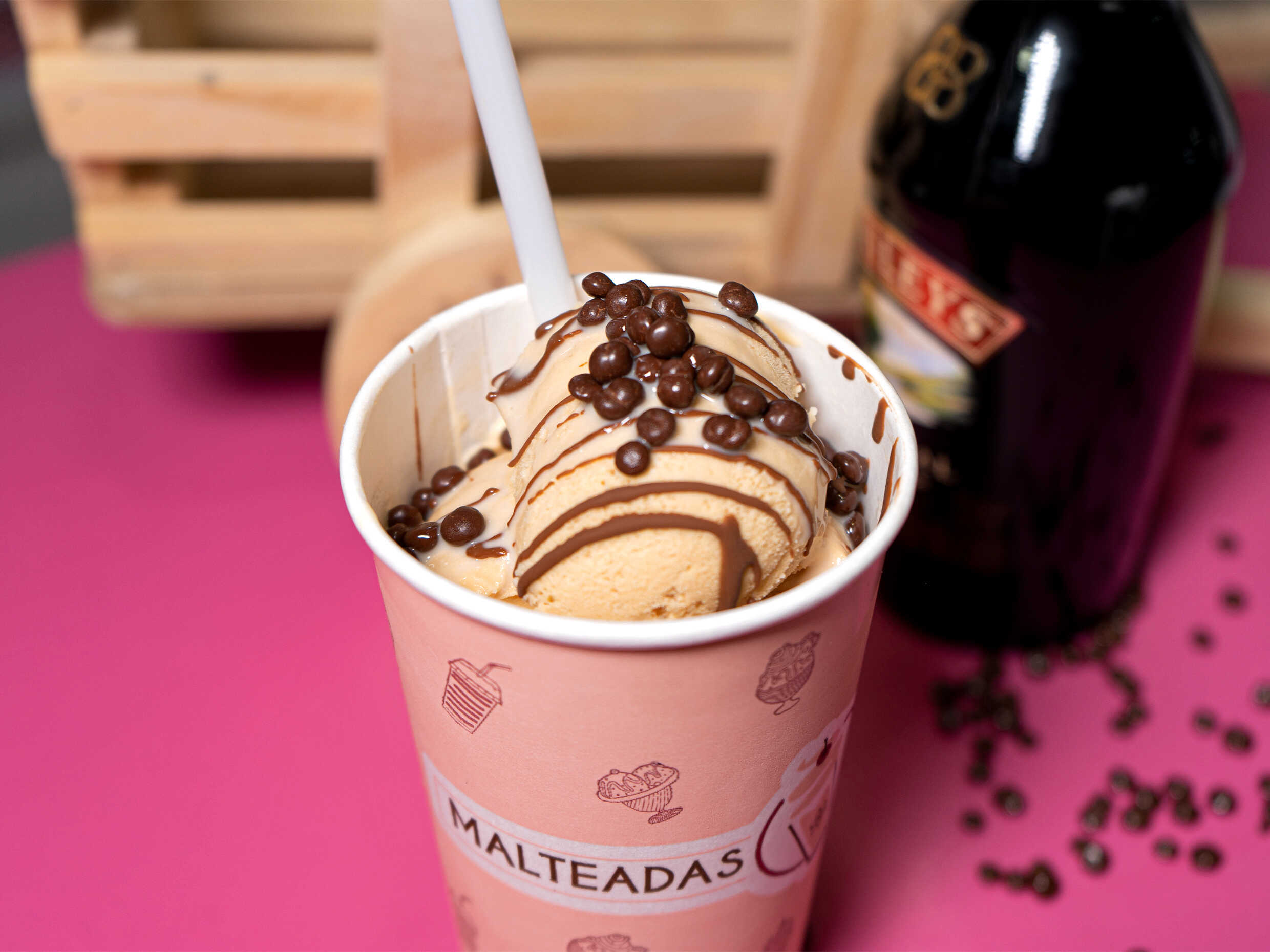 Tradicional crema de whisky fusionada con cremoso helado de 3 leches y vainilla, nuestra salsa de caramelo y bolitas de arroz soplado cubierto de chocolate. Te llegara una malteada de 16onz.