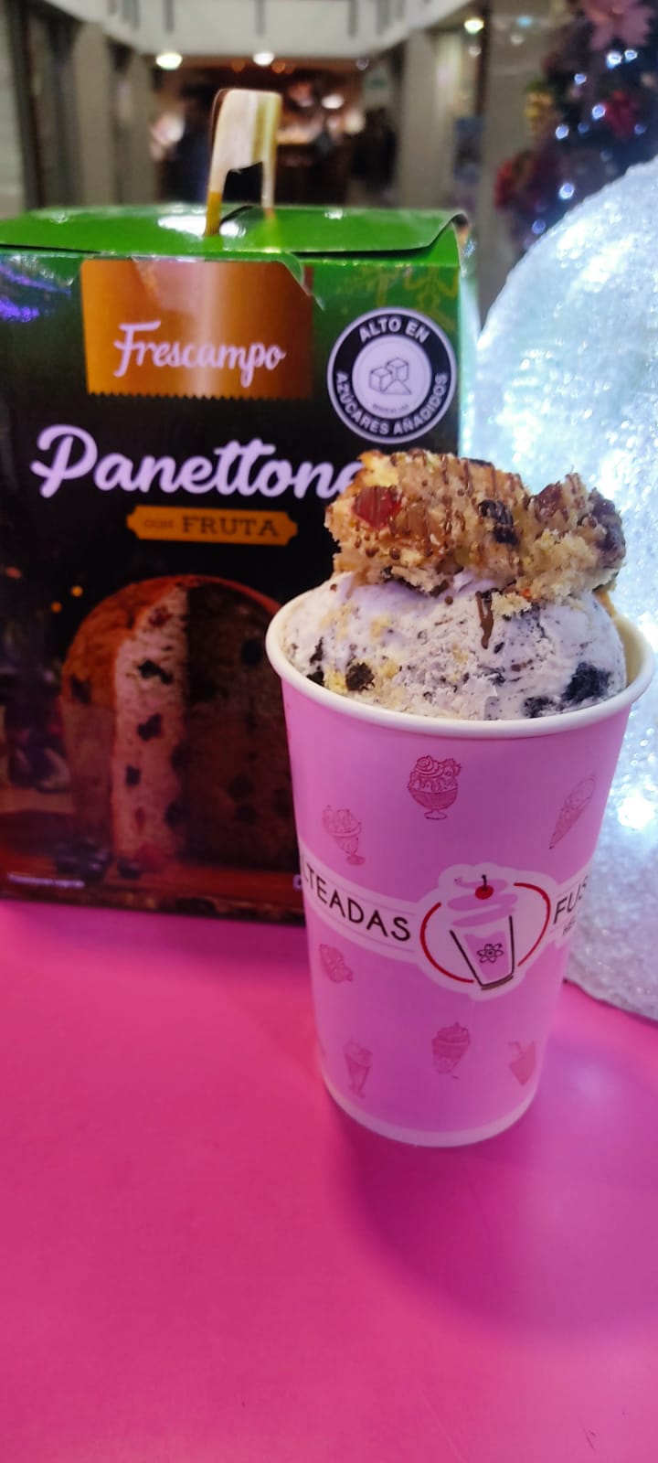 Cremoso helado de brownie y cookies and cream, fusionado con trozos de panettone navideño, dulce de moras y decorado con cereza.