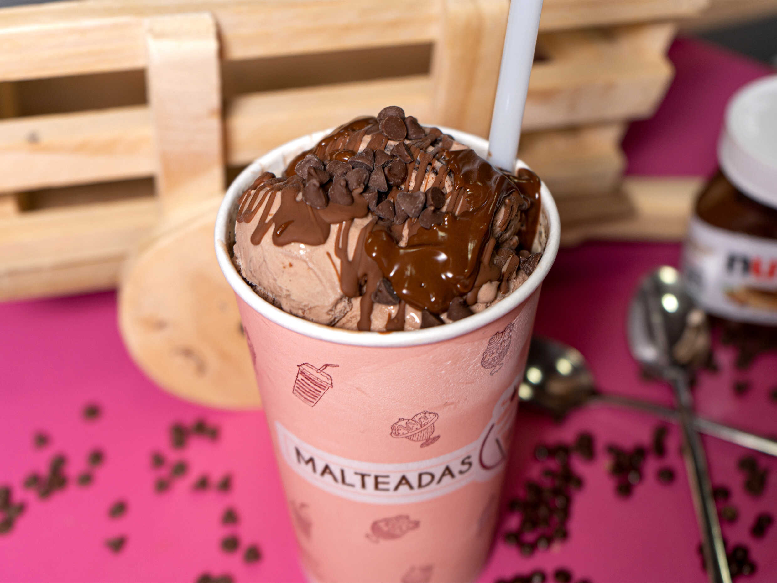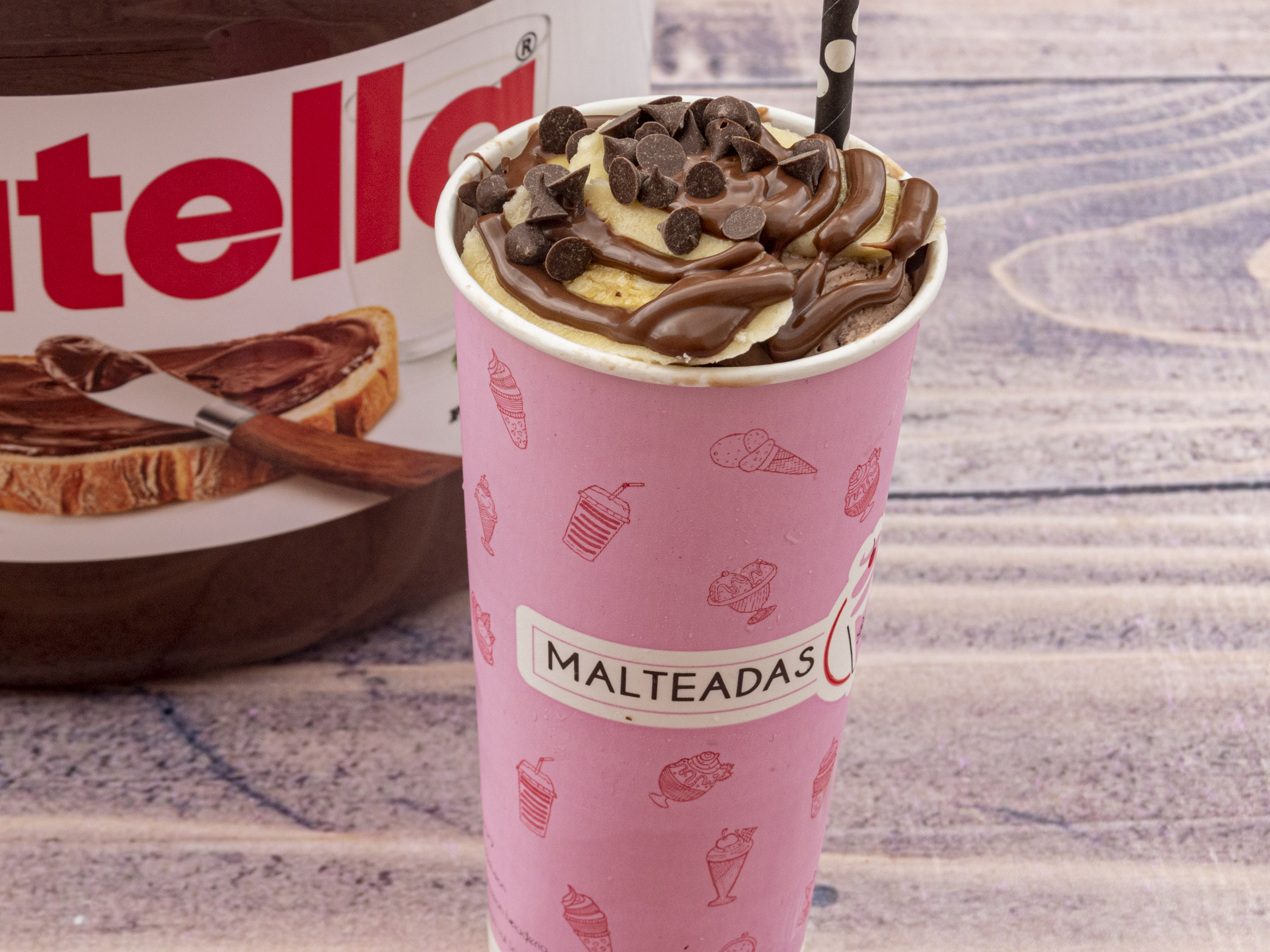 Deliciosas malteadas de Nutella fusionada con helado de vainilla y chocolate, decorada con tajadas de banano fresco y chips de chocolate.