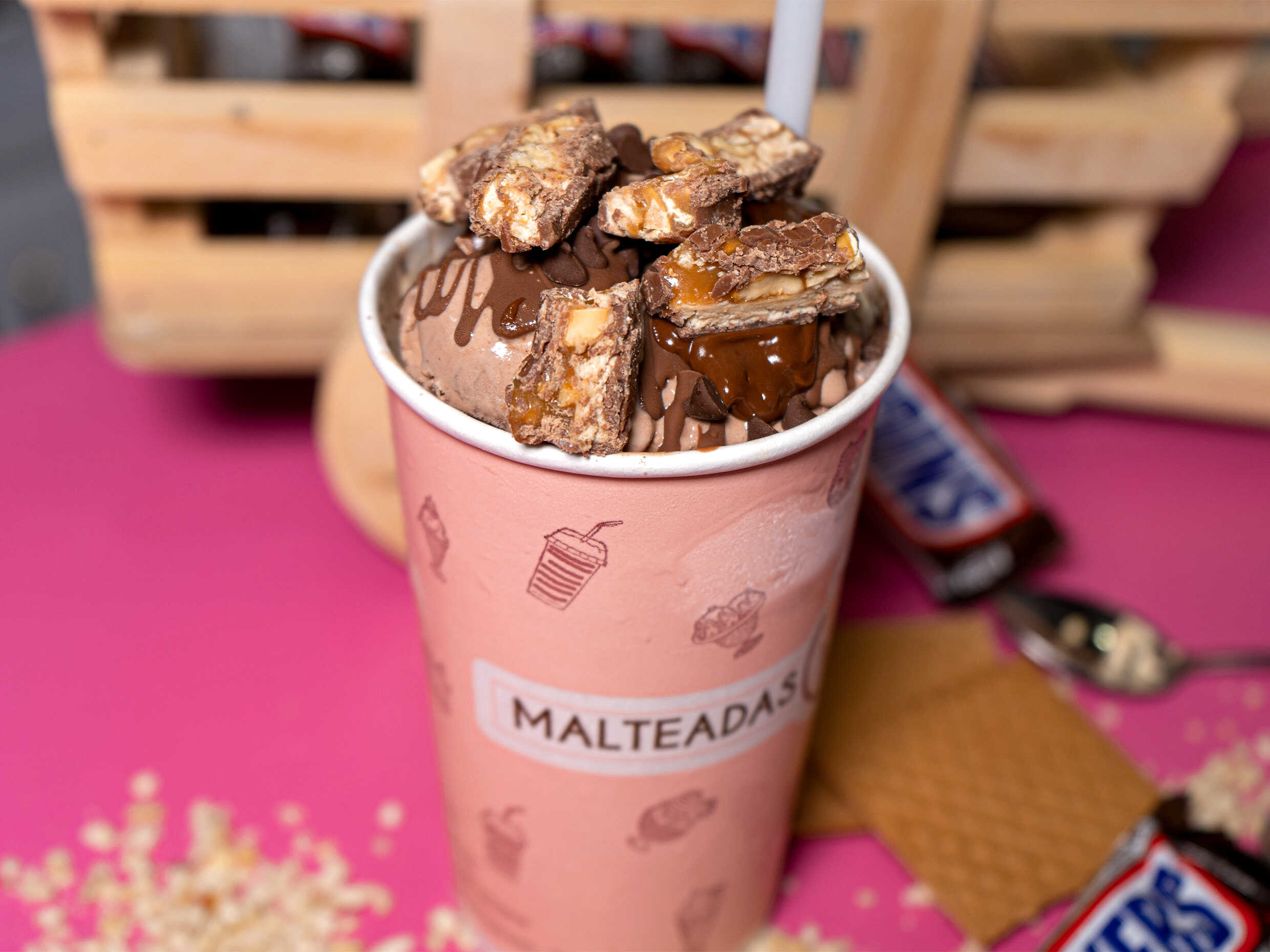 Chocolatina Snickers en trozos fusionados con helado de brownie y chocolate, decorado con salsa de chocolate y trozos de snicker. Te llegara una malteada de 16onz.