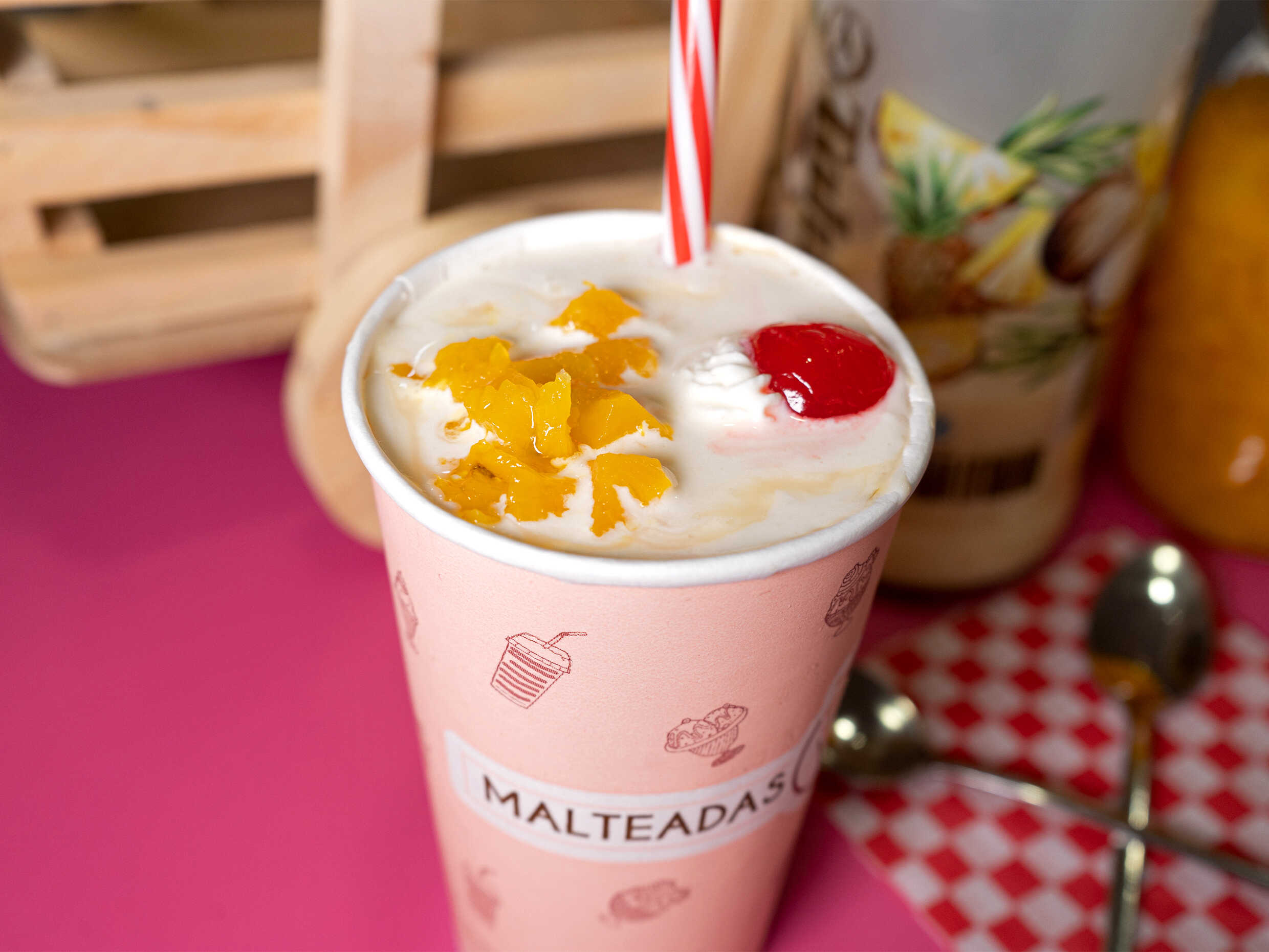 Deliciosa malteada a base de fruta natural mango y maracuya, base de helado de vainilla y decorada con cereza.