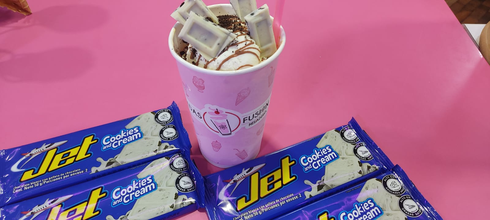 Chocolatina Jet Cookies and Crean con helado de vainilla y cookies and cream y salsa de chocolate