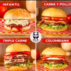 Lleva 4 Hamburguesas elección de la casa: 1 Hamburguesa Colombiana + 1 Hamburguesa Triple Carne + 1 Hamburguesa Carne y Pollo + 1 Hamburguesa Menú Infantil