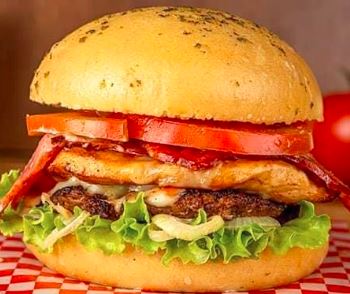Hamburguesa de 150 Gramos de carne artesanal, 150 g de pechuga de pollo, queso tocineta, lechuga, tomate, salsas, tomate, rosada.