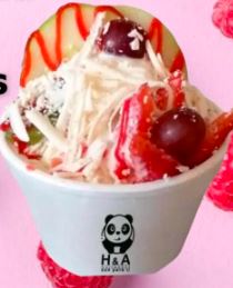 2 Ensaladas de Frutas 24 Oz: Ensalada con Banano, papaya, manzana, piña o mango, crema de leche, queso, galletas, salsa de fresa y 1 bola de helado.