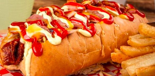 Perro con Pan salchicha, ripio, salsas, rosada, tomate, piña y tocineta.