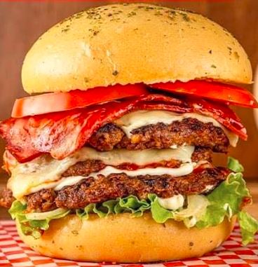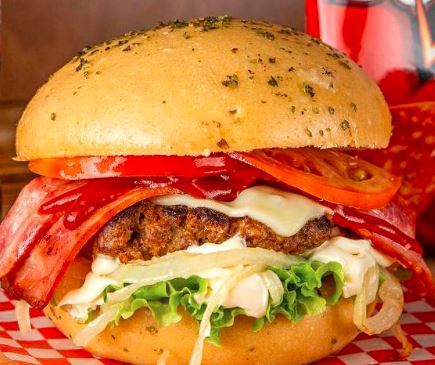 Hamburguesa de 450 Gramos de res artesanal, queso, tocineta, lechuga, tomate y salsas, tomate, rosada.