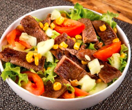 Ensalada con Lechuga, Tomate, Maíz Tierno, Carne asada, Pepino Cohombro y vinagreta.