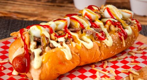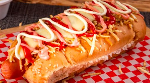 Choriperro con Pan, chorizo, ripio, salsas, rosada, tomate, piña, queso y tocineta.